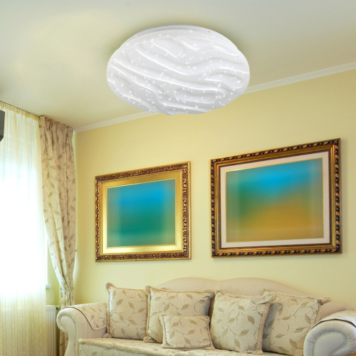 Не менее важным преимуществом является эксклюзивный дизайн электросветильника. Динамичные рельефные волны безупречно соединяются с округлым плоским корпусом. Изюминка LED люстры эффект звездного неба! Мерцание на потолке поможет создать романтичную атмосферу в спальне, добавить магии детской и украсить гостиную.