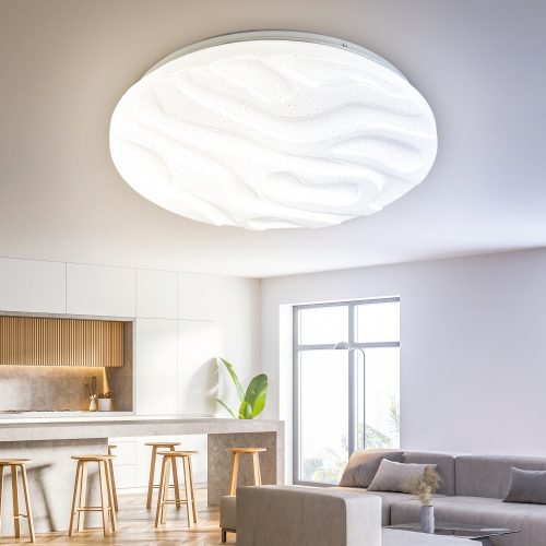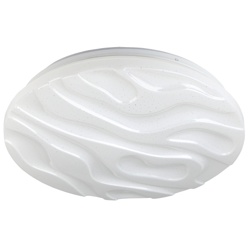 Особенный дизайн плафона в виде рельефных волн гармонично сочетается с круглым корпусом. Изюминка LED светильника эффект звездного неба! Хаотичное мерцание поможет создать романтичную атмосферу в спальне, добавить волшебства детской и разнообразить гостиную.