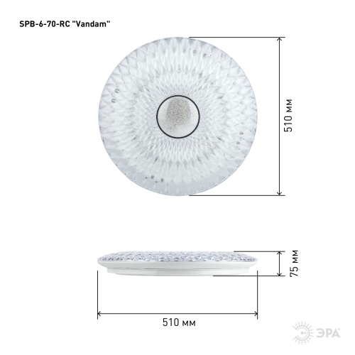 Светодиодный светильник ЭРА SPB-6-70-RC серии Vandam можно крепить на стену или потолок. Его отличает сочетание классического дизайна и современных технологий в изготовлении. Основание светильника выполнено из металла, на котором расположен безопасный LED-модуль. Рассеиватель изготовлен из легкого пластика, имеет диаметр 51 см. Яркость и цветовую температуру светильника можно регулировать, для чего в комплект входит пульт дистанционного управления. Цветовая температура данной модели изменяется в пределах от 4000 К до 6000 К. Мощность лампы составляет 70 Вт. Светодиодный светильник гармонично впишется в классический интерьер, привнесет в него изысканность и утонченность.