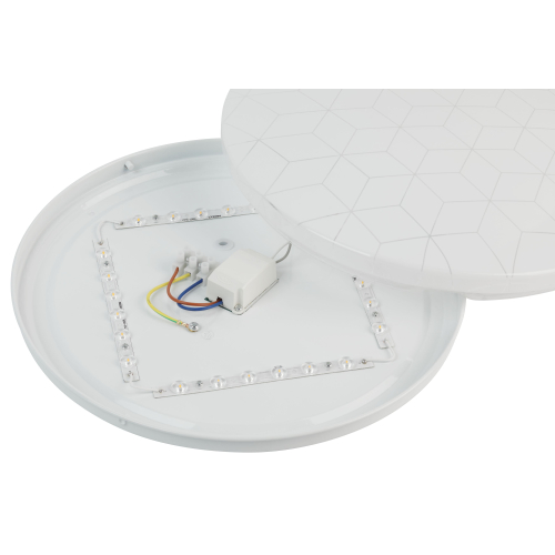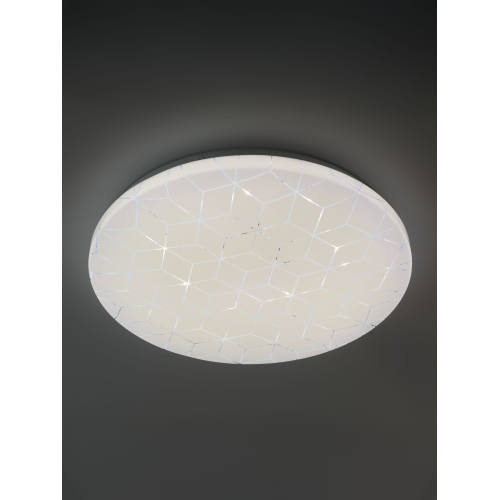 Компактные размеры 325×55 мм позволяют устанавливать светильник даже в помещениях с низкими потолками. Степень защиты IP20 делает его идеальным для сухих интерьеров. Геометрический узор на плафоне мягко подсвечивается при включении, создавая лёгкий декоративный эффект.