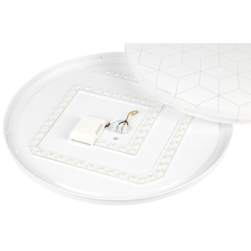 Компактные размеры 468×60 мм позволяют устанавливать светильник даже в помещениях с низкими потолками. Степень защиты IP20 делает его идеальным для сухих интерьеров. Геометрический узор на плафоне мягко подсвечивается при включении, создавая лёгкий декоративный эффект.