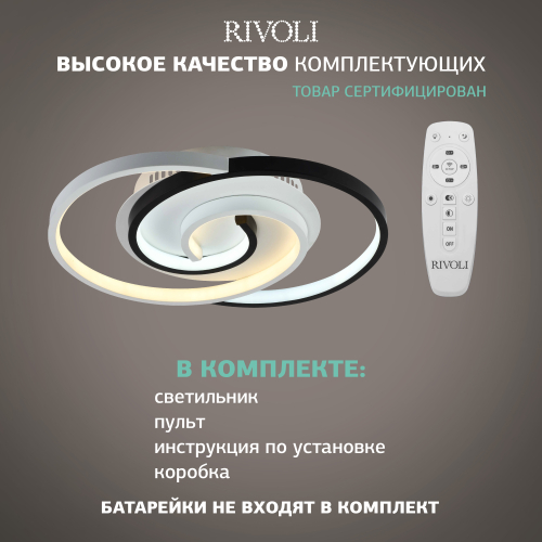 Светильники светодиодные LED потолочные Rivoli с пультом дистанционного управления представлены моделями 57 Вт (арт. 6101-101) и 73 Вт (арт. 6101-103). Потолочные светильники со встроенными светодиодами и пультом ДУ – популярное решение для жилых пространств. Такие LED-светильники потолочные полюбились покупателям за удобство при включении и выключении света, множество режимов работы и за качественный ровный свет без мерцания и бликов. В LED-светильниках на потолок Rivoli применены яркие оригинальные светодиоды, не тускнеющие даже через годы постоянного использования. Оригинальный дизайн плафона и выбор цветовой температуры / яркости – в числе многочисленных преимуществ данной светодиодной потолочной люстры от итальянского бренда.