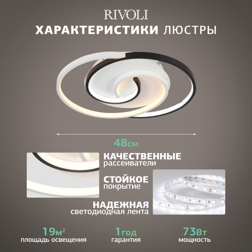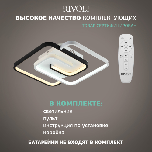 Люстры светодиодные LED потолочные Rivoli с пультом дистанционного управления представлены моделями 57 Вт (арт. 6101-101) и 73 Вт (арт. 6101-103). Светильники потолочные LED со встроенными светодиодами и пультом ДУ – актуальный вариант для жилых комнат. Эти дизайнерские LED-светильники потолочные популярны за удобство при включении и выключении света, множество режимов работы и за качественное ровное освещение без мерцания и бликов. В LED-светильниках на потолок Rivoli установлены яркие оригинальные светодиоды, не теряющие свои высокие характеристики спустя годы постоянного применения. Дизайнерский плафон, универсальность, выбор цветовой температуры / яркости, доступная цена – в числе многочисленных преимуществ данной светодиодной люстры потолочной.