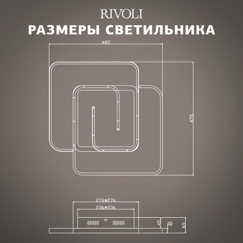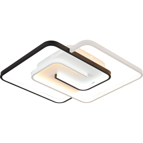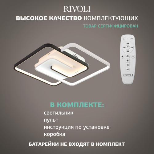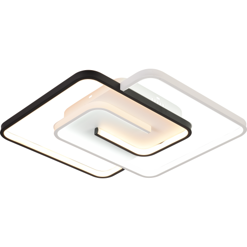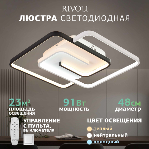 Яркая светодиодная люстра на потолок мощностью 91 Вт. Потолочный LED-светильник Rivoli (арт. 6102-103) представляет собой два светящихся квадрата контрастных цветов – чёрного и белого. Габариты LED-люстры: 485 х 475 мм. Толщина корпуса – всего 20 мм, что позволяет с успехом использовать люстры потолочные светодиодные Rivoli для невысоких потолков. В коллекции есть люстра LED светодиодная меньшей мощности – 66 Вт (арт. 6102-101).
