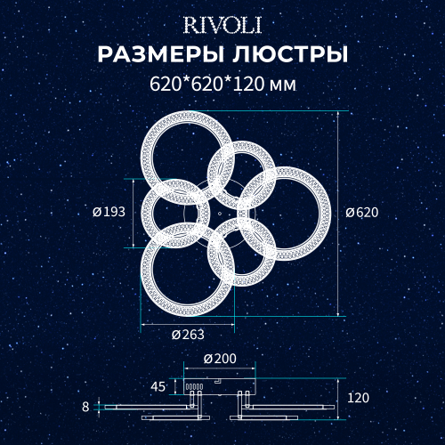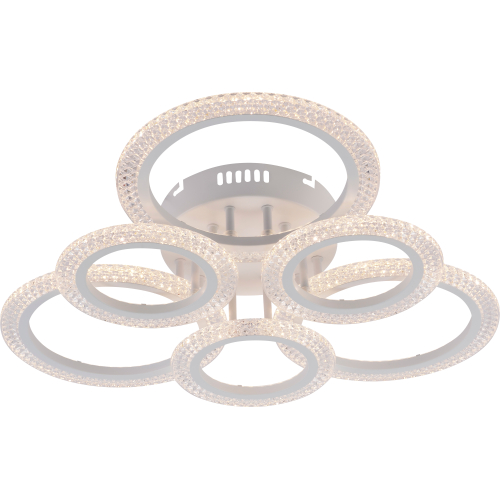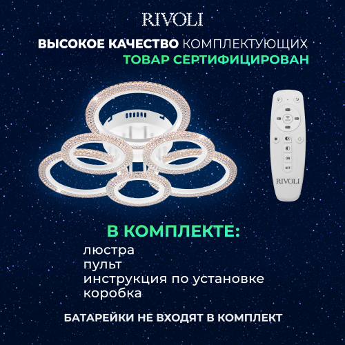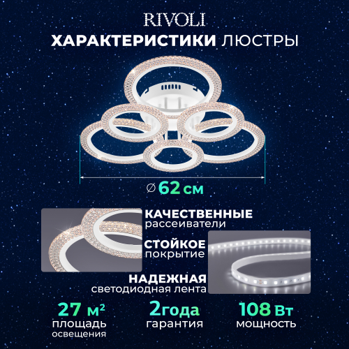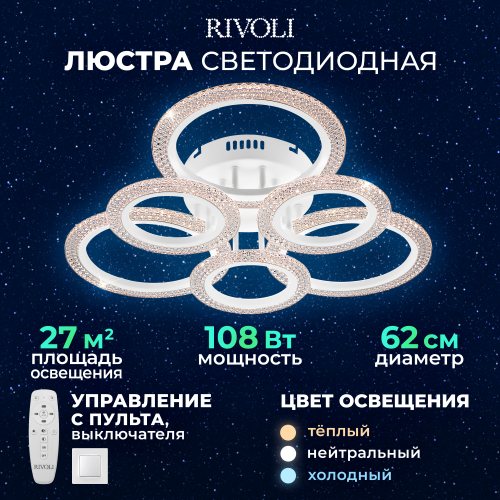 Шесть кольцевых плафонов LED-люстры Rivoli окантованы прозрачным узорчатым акрилом, создающим красивый световой эффект. Светильник светодиодный потолочный итальянской дизайнерской коллекции имеет высокую мощность – 132 Вт, а значит подходит в качестве основной люстры в гостиную, люстры в просторную спальню. Многофункциональный светильник LED потолочный светодиодный с пультом ДУ даёт возможность регулировать на расстоянии яркость и цветовую температуру. Тёплый цвет освещения помогает расслабиться, холодный – сконцентрироваться. Нейтральный белый свет люстры LED максимально приближен к естественному дневному. Другие LED светильники коллекции Rivoli : арт. 6107-401, 6107-103, 6107-104, 6107-105, 6107-106, 6107-108, 6107-109, 6108-106.
