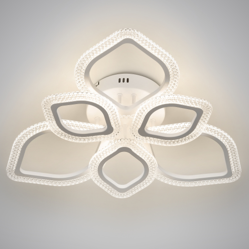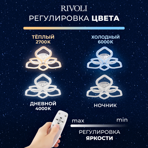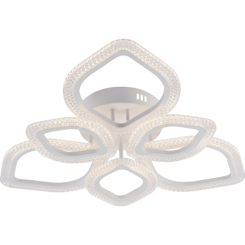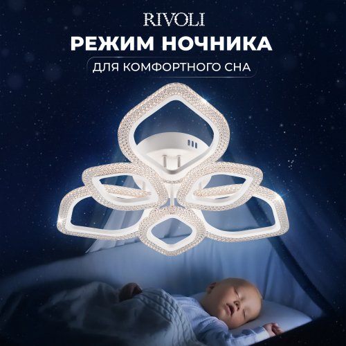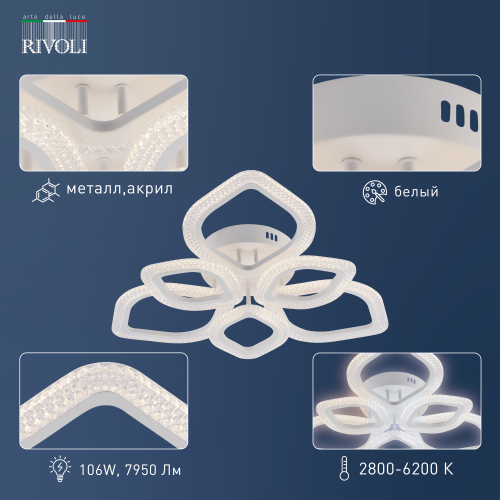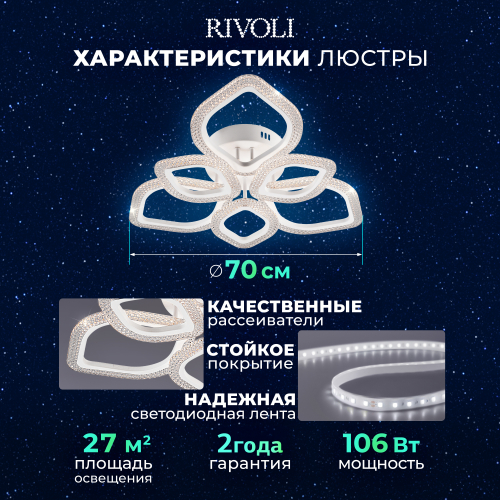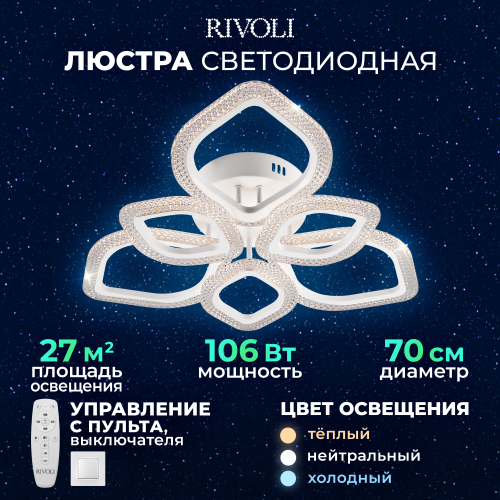 Светильник-люстра светодиодная с шестью LED плафонами-лепестками – Rivoli (арт. 6110-107). Белый потолочный светодиодный светильник с пультом дистанционного управления. Люстра потолочная светодиодная с регулировкой яркости и цветовой температуры освещения. Мощность этой современной люстры – 106 Вт. Потолочный светодиодный светильник Rivoli подходит для организации основного освещения в гостиной, спальне, в загородном доме, в квартире-студии. Разные режимы свечения светодиодов позволяют комфортно чувствовать себя в пространстве. Коллекцию дополняют люстры LED светодиодные потолочные с пультом – арт. 6110-103, 6110-104, 6110-105, 6110-101, 6110-106. К заказу доступен также настенный светодиодный LED светильник Rivoli – арт. 6110-401.