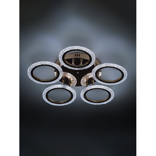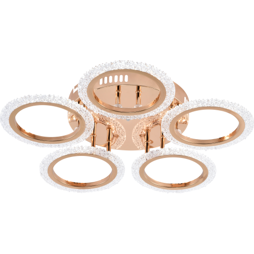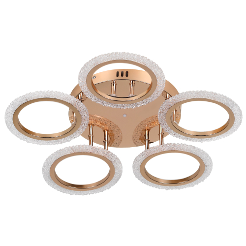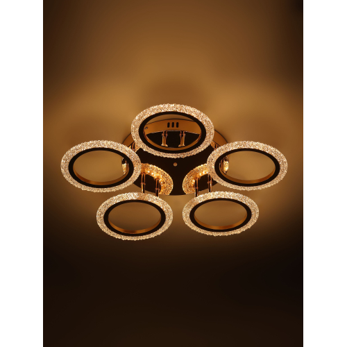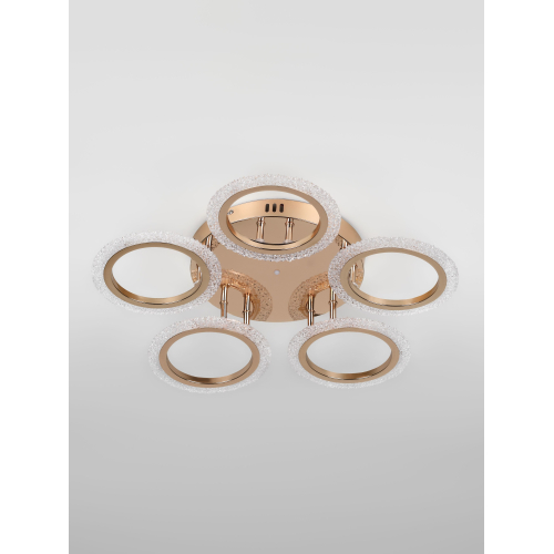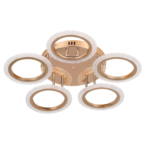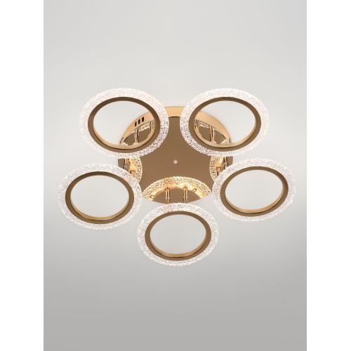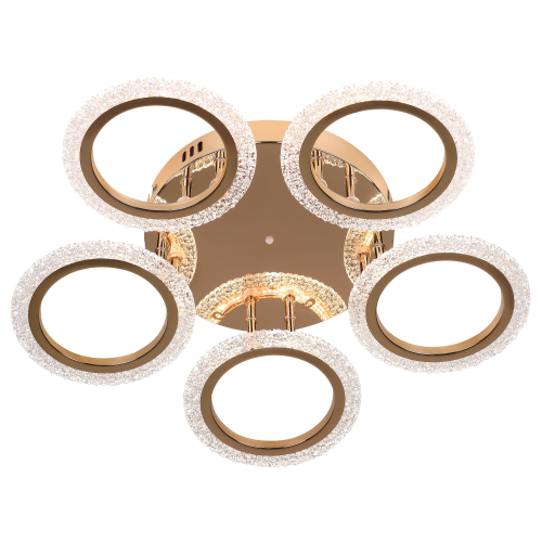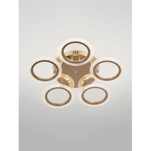 Серия потолочных светодиодных светильников в форме колец с элегантным золотым покрытием и рельефным акрилом. Оснащены пультом ДУ для регулировки яркости и режимов освещения. Мощность — от 42 до 70 Вт. Современный дизайн и удобство управления для стильного интерьера.