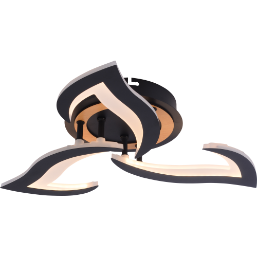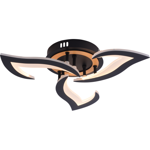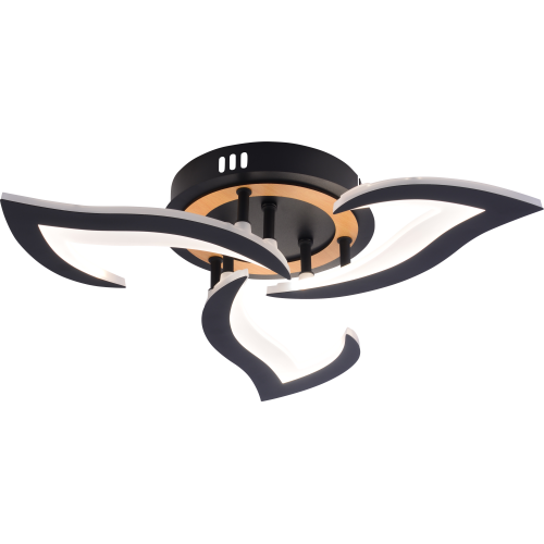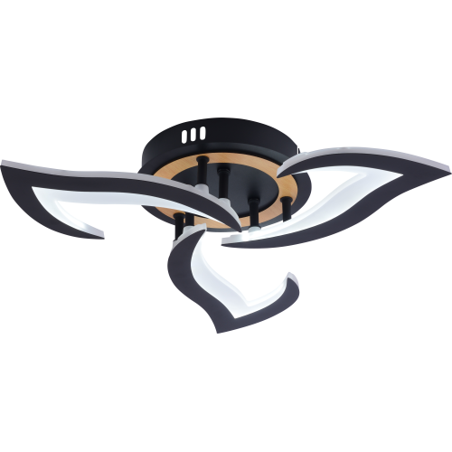 Серия черных светодиодных потолочных светильников с элементами натурального дерева включает модели мощностью 42 и 84 Вт. В комплекте пульт ДУ для удобного регулирования яркости и цветовой температуры от 3000 до 6250 К, позволяя настроить освещение под любые потребности и атмосферу.