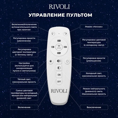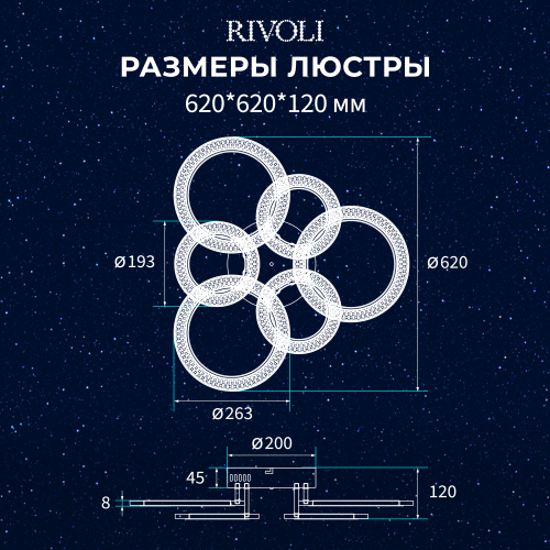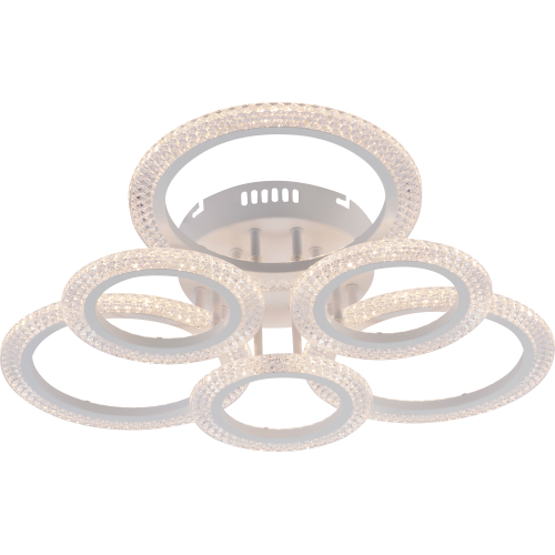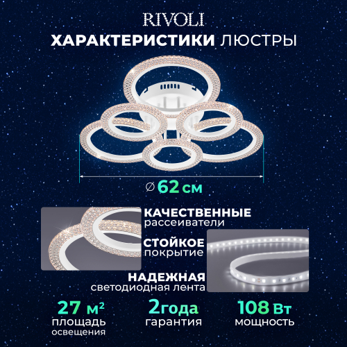 Шесть кольцевых плафонов LED-люстры Rivoli Marion окантованы прозрачным узорчатым акрилом, создающим красивый световой эффект. Светильник светодиодный потолочный итальянской дизайнерской коллекции Marion имеет высокую мощность – 132 Вт, а значит подходит в качестве основной люстры в гостиную, люстры в просторную спальню. Многофункциональный светильник LED потолочный светодиодный с пультом ДУ даёт возможность регулировать на расстоянии яркость и цветовую температуру. Тёплый цвет освещения помогает расслабиться, холодный – сконцентрироваться. Нейтральный белый свет люстры LED максимально приближен к естественному дневному. Другие LED светильники коллекции Rivoli Marion: арт. 6107-401, 6107-103, 6107-104, 6107-105, 6107-106, 6107-108, 6107-109, 6108-106.