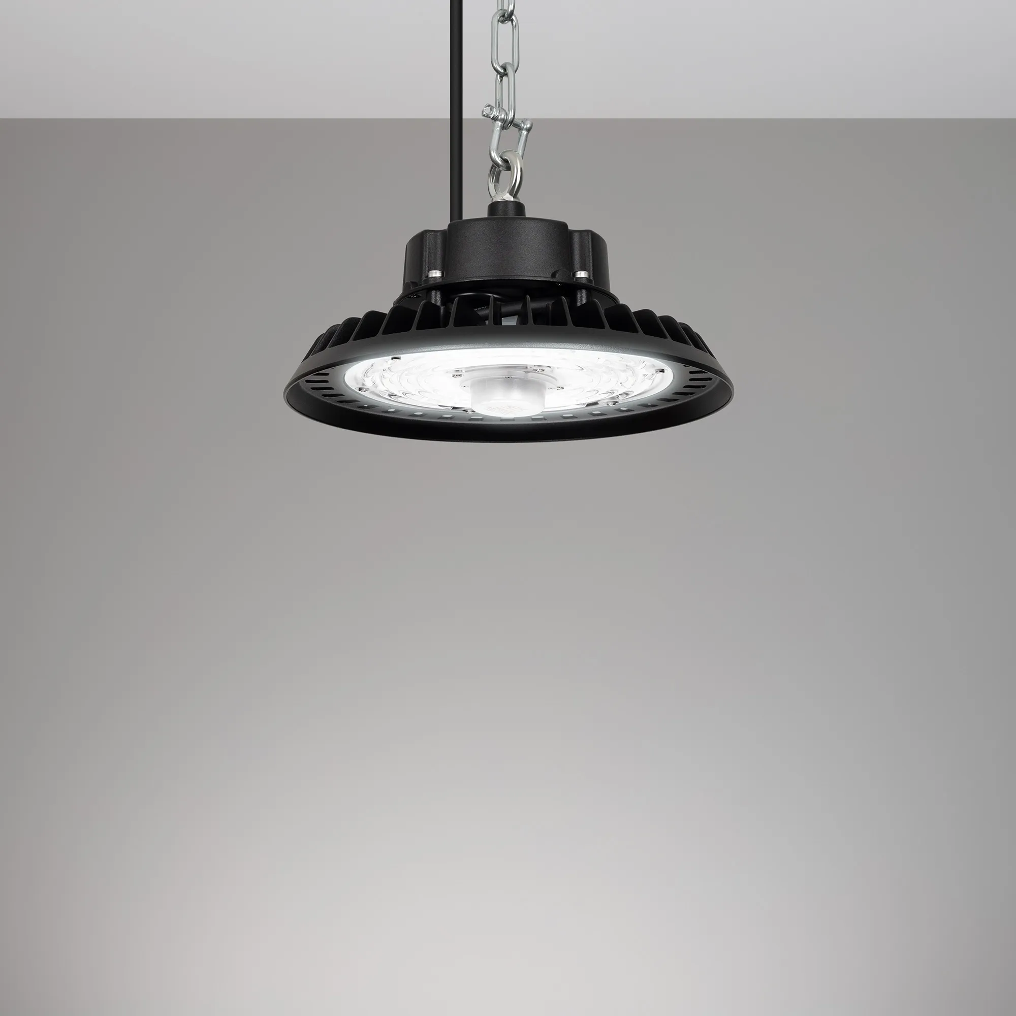 Светильник SP-ARIVA-MOTION мощностью 100 Вт, дневного цвета свечения 5000K, световым потоком 15000 лм и углом рассеивания 60 градусов предназначен для освещения складских и промышленных помещений. Черный цвет корпуса, габариты Ф260xH140 мм, степень пылевлагозащиты IP65., индекс цветопередачи CRI 80, степень ударопрочности IK08. Рым-болт в комплекте. Датчик настраивается с помощью пульта 052018 (один на все датчики). Доступно управление по протоколу 0-10В.