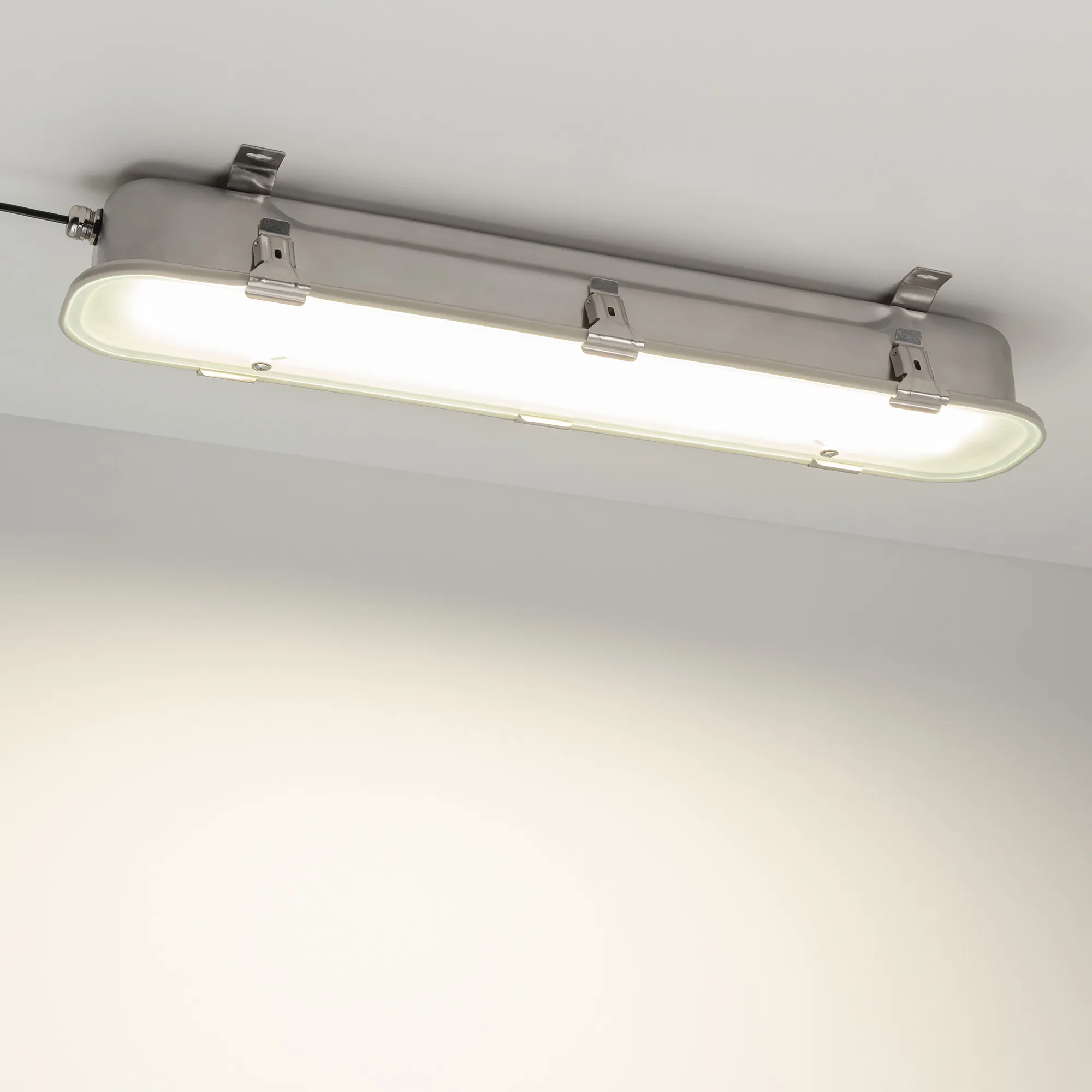 Влагозащищенный линейный светильник SP-KATANO мощностью 20 Вт, дневного цвета свечения 4000K, световым потоком 2100 лм и углом рассеивания 100° градусов предназначен для освещения в технических и в пожароопасных помещениях. Прямоугольный корпус выполнен из нержавеющей стали AISI 304, габариты 708x138x104 мм, степень пылевлагозащиты IP65. Индекс цветопередачи CRI 80. Материал рассеивателя: закаленное стекло. Возможность накладного и подвесного монтажа позволяет легко адаптировать светильники под любые требования помещения. Для подвесного монтажа необходимо использовать подвесы 060754.