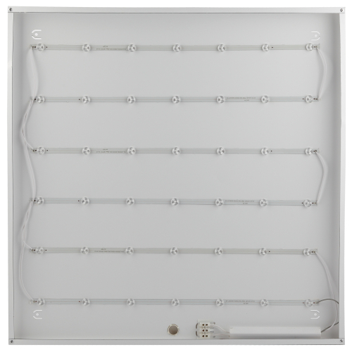 Светодиодная панель. Светит, как ультратонкая панель приятным равномерным светом, и не уступает по яркости, при этом имеет значительно более низкую цену. Драйвер встроен в корпус светильник полностью готов к установке и легко монтируется на потолок любого типа как в качестве встраиваемого светильника, так и накладным или подвесным способом. Легко устанавливается в потолки Армстронг, на гипсокартонные, бетонные потолки. Позволяет в разы ускорить, а значит и удешевить монтаж. Цветовая температура: 6500 К - холодный белый свет, повышающий работоспособность и концентрацию внимания. Светильник создаёт качественный ровный свет: индекс цветопередачи Ra - выше 80, что обеспечивает отличную цветопередачу; коэффициент пульсаций - ниже 5% - соответствует самым жестким требованиям СанПин. Такое освещение рекомендовано для учебных, дошкольных, медицинских учреждений. Является идеальным решением для офисных и общественных пространств. Габаритная яркость: 3550 кд/м2. Класс светораспределения: П. Класс по ограничению яркости: 1.