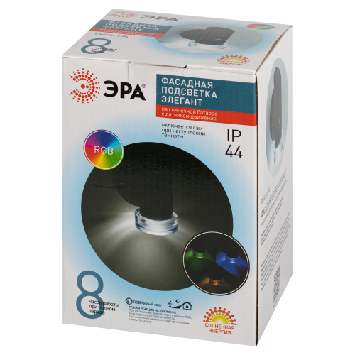 ЭРА ERAFS012-04 «Элегант» (арт. Б0057595) - уникальная новинка на рынке фасадных беспроводных светильников! RGB-светодиоды светят разными цветами, включая нейтральный белый для практичного базового освещения. Отличное решение для эффектного оформления фасада здания. При наступлении темноты автоматически включается мультиколор-подсветка, меняющая цвета. При появлении движения вблизи светильника включается яркое белое освещение. При отсутствии активности в течение 30 секунд датчик движения снова переключает фасадную подсветку на режим RGB. Встроенная солнечная батарея делает данный светильник экологичным и экономичным.