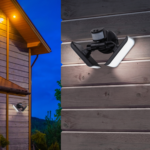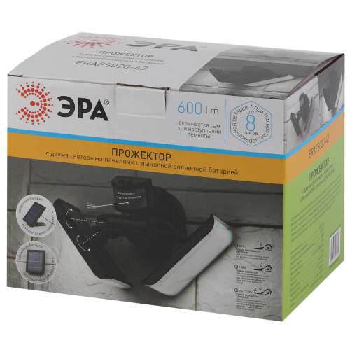 Влагозащищённый светодиодный прожектор ЭРА ERAFS020-42 на улицу с двумя световыми панелями и выносной солнечной панелью, которая может монтироваться отдельно от источника света. 100 ярких качественных светодиодов! Световые потоки направлены в противоположные стороны, позволяя освещать большую площадь. Угол наклона каждой панели можно регулировать. Между LED-панелями расположен датчик движения.