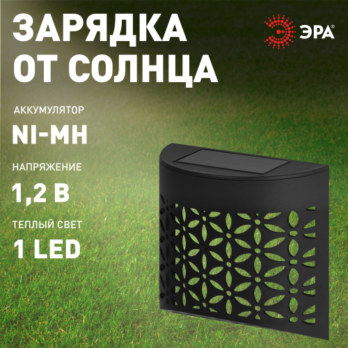 Новинка сезона! Настенный светильник ЭРА ERAFS024-01 (арт. Б0057591) на солнечной батарее с перфорированным орнаментом в виде цветочных лепестков. Беспроводная подсветка проецирует на фасад красивый световой рисунок. Заряжается в течение светового дня и автоматически включается с наступлением темноты. Габариты: 11х11х5 см. Солнечная панель расположена в верхней части фасадного светильника. При полном заряде проработает в темноте до 8 часов, создав вечерний уют на загородном участке или балконе. Быстрый и простой монтаж. Фасадные светильники ЭРА ERAFS024-01 изготовлены из металла с нержавеющим покрытием и высокопрочного пластика. Эффектно смотрятся в составе группы из нескольких штук.