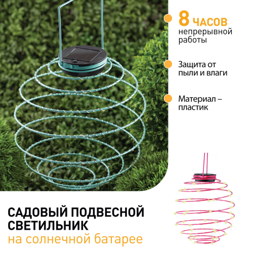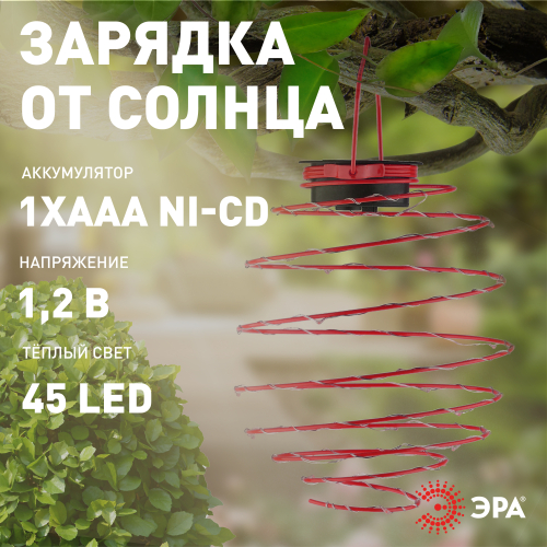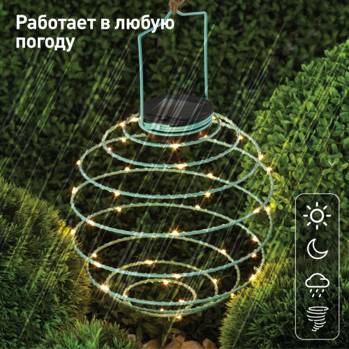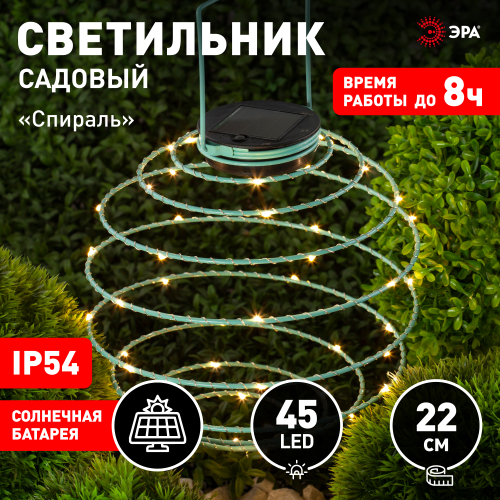 Подвесной светильник для сада ERASF012-29 "Спираль" необычно стилизует любое уличное пространство. Небольшие размеры позволят Вам расположить подсветку в саду, подвесить на дерево, изящно подсветить вход в террасу, дом или фасад. Конструкция из пластика высотой 22 см имеет простое крепление. Садовый светильник функционирует на солнечной батарее. Такой тип получения энергии является самым экологичным, энергоемким, а также бесшумным. Питание происходит во включенном режиме, в светлое время суток. После захода солнца спираль начинает светиться теплым желтым светом. Необычный дизайн придает устройству динамики, что поможет создать праздничную обстановку. Работа от солнечной батареи рассчитана на 8 часов непрерывной работы. ПВХ в составе светильника обеспечивает высокую степень защиты от пыли и влаги, а также устойчивость к механическим повреждениям. Это позволяет оставлять подсветку на улице в плохую погоду. Обращаем Ваше внимание, что перед использованием фигурки её необходимо включить и зарядить. Светильник заряжается в течение всего светового дня. Уличный светильник "Спираль" на солнечной батарее от компании ЭРА прекрасный вариант для создания веселого настроения на Вашем участке.