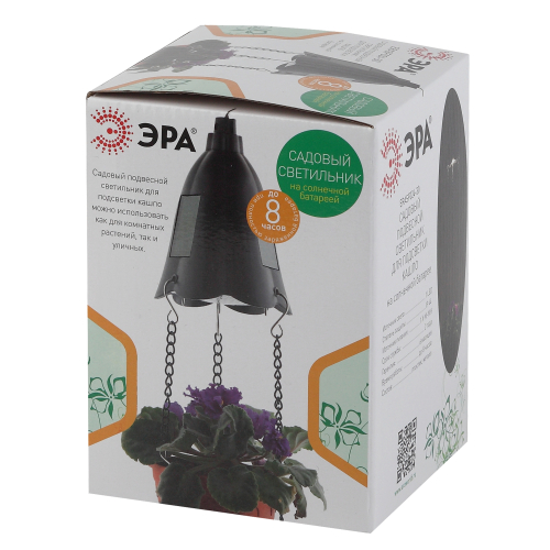ЭРА ERASF024-30 (арт. Б0044237) - светодиодный садовый светильник с металлическими подвесами для размещения и подвески кашпо. Цветы будут красиво освещены даже в тёмное время суток. Идеальное решение для оформления беседок и веранд. Светильнику под кашпо не нужно подключение к электросети - он работает от встроенных в корпус солнечных панелей. Лёгкая высокопрочная конструкция обеспечивает долговечность и практичность данного садового светильника. Общая высота светильника с подвесами - 16 см. 3 светодиодных лампочки автоматически включаются вечером. Светодиодные батареи накапливают энергию солнца даже в пасмурную погоду.