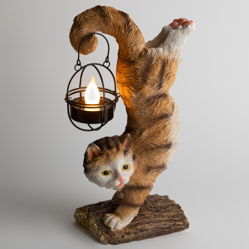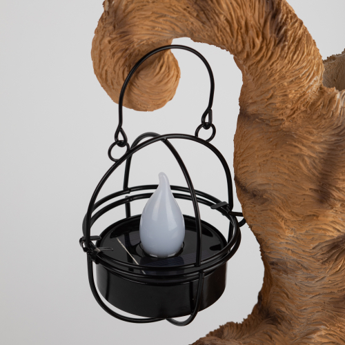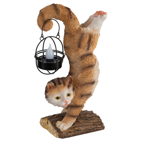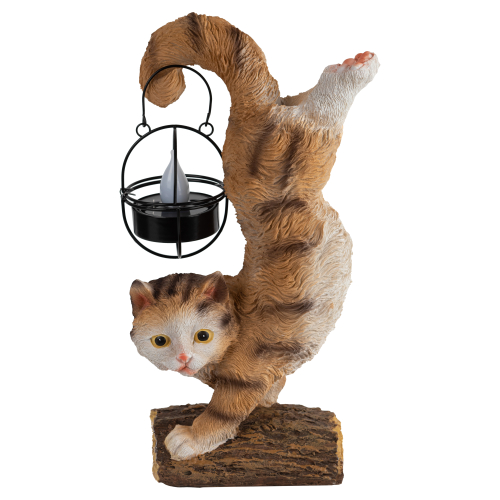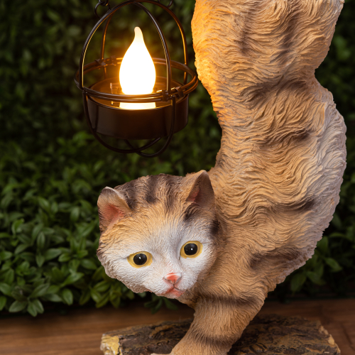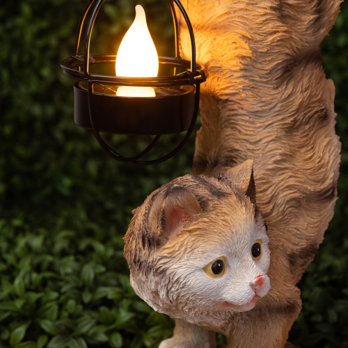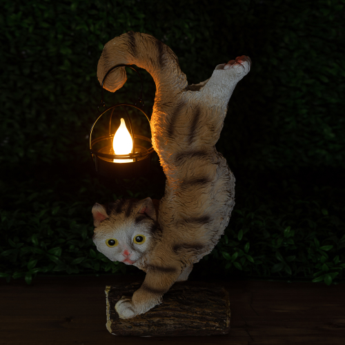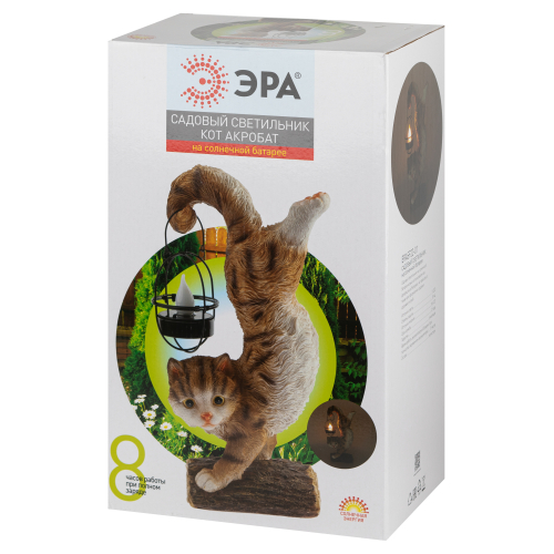 Фигурка садовая декоративная ЭРА ERASF22-01 станет очаровательным украшением Вашего загородного участка! Этот уличный светодиодный светильник можно разместить в саду, украсить им клумбу, альпийскую горку, подсветить тропинку или террасу на даче. Фигурка "Кот Акробат" высотой 37 см выполнена из полистоуна и имеет отличную детализацию. Беспроводной садовый фонарь работает на солнечной батарее - данный тип получения энергии является самым экологичным, энергоемким, а также бесшумным. Питание происходит во включенном режиме, днем, а с наступлением ночи фигурка сама загорается и работает до 8 часов. При необходимости фонарик можно снять с хвоста котика. Имитация горения свечи и мягкий теплый свет сделают Ваш вечер особенно уютным!