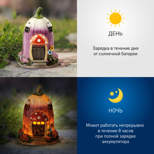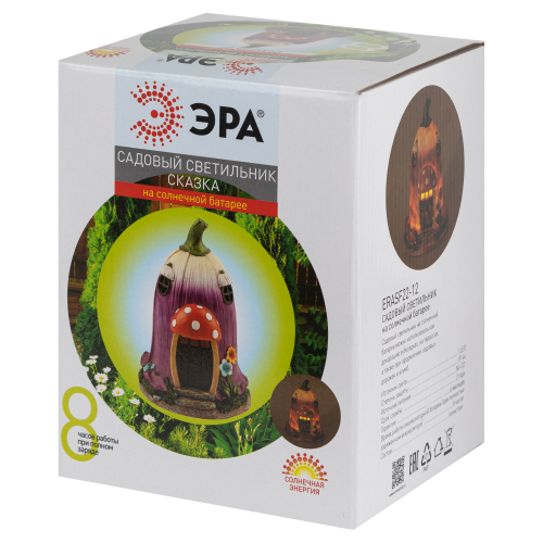 Фигурка садовая "Сказка" от бренда ЭРА станет очаровательным декором Вашего садового участка! Этот уличный светодиодный светильник, напоминающий жилище гномика, преобразит территорию у дома - можно украсить им клумбу, альпийскую горку, подсветить тропинку или террасу дачи. Миниатюрный фонарь ERASF22-12 высотой 19 см выполнен из полистоуна и тщательно детализирован. Беспроводной садовый светильник работает на солнечной батарее, этот тип получения энергии является самым экологичным, энергоемким, а также бесшумным. Питание происходит во включенном режиме в солнечную погоду, фигурка сама загорается с наступлением ночи и работает до 8 часов. Сказочный домик с теплым светом наполнит Ваш сад уютом и таинственностью!