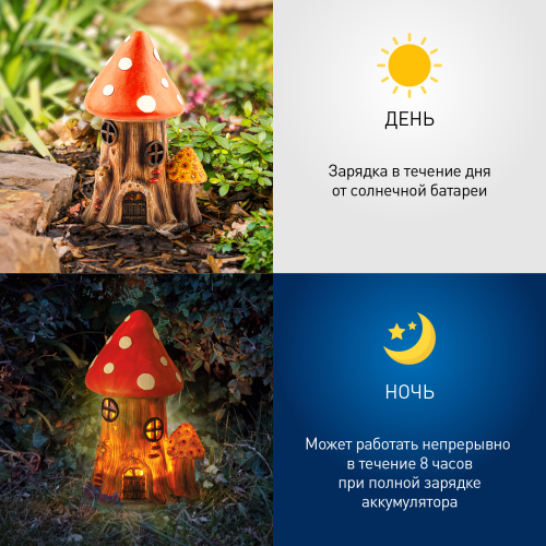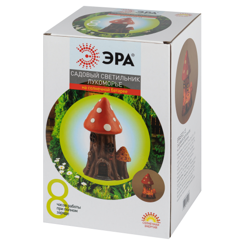 Фигурка садовая "Лукоморье" от компании ЭРА станет милым украшением Вашего загородного участка! Этот уличный светодиодный светильник, похожий на жилище гнома, оживит пейзаж дачи - разместите его в палисаднике, подсветите террасу, клумбу, кустарник, аллею или вход в дом. Фонарь ERASF22-13 высотой 23 см выполнен из полистоуна, все детали хорошо проработаны. Беспроводной садовый светильник функционирует на солнечной батарее - данный тип получения энергии является самым экологичным, энергоемким, а также бесшумным. Питание происходит во включенном режиме в солнечную погоду, фигурка автоматически загорается с наступлением ночи и работает до 8 часов. Сказочный домик с теплым светом и крышей в виде шляпки мухомора подарит вашему саду уют и загадочность!