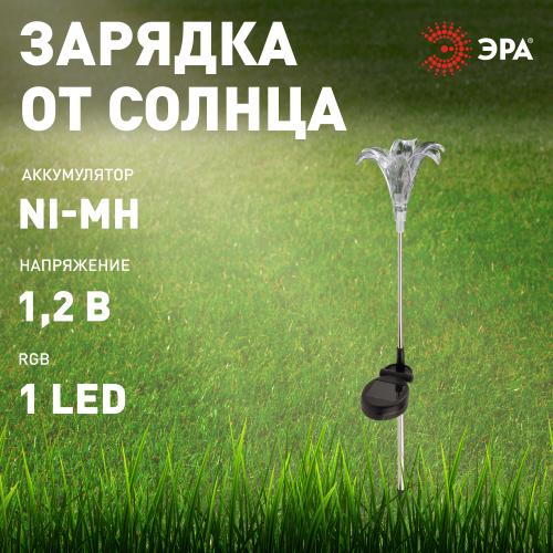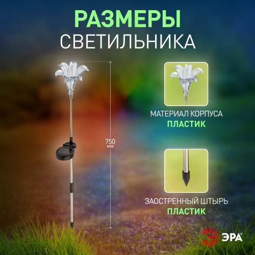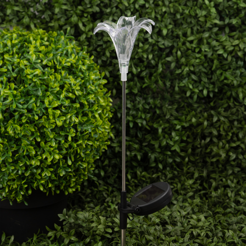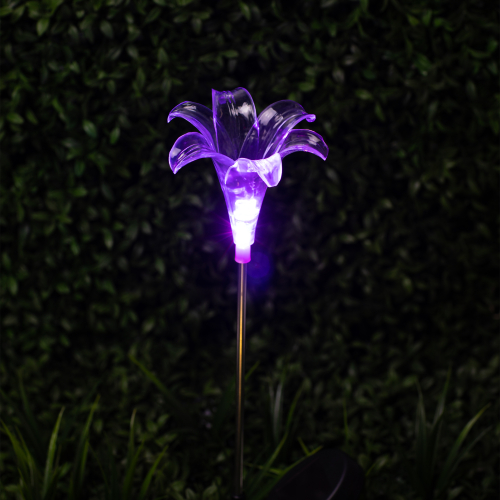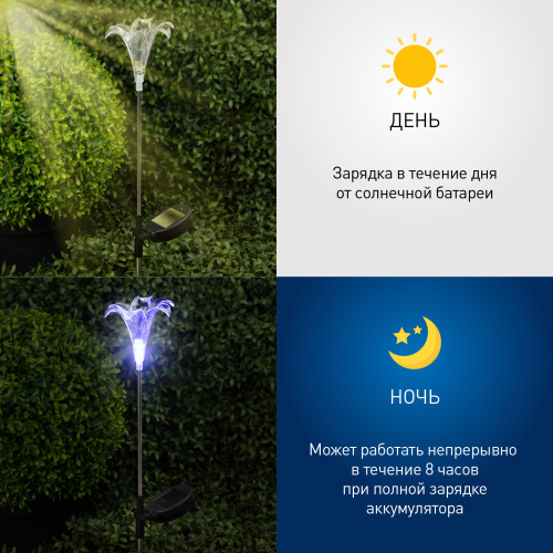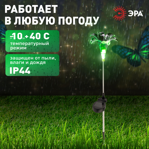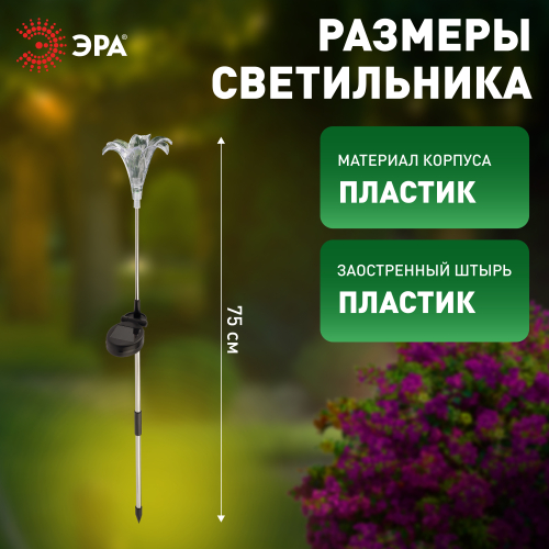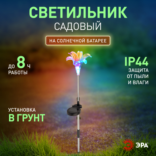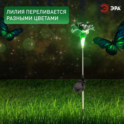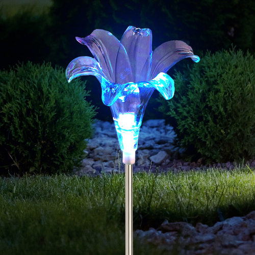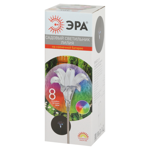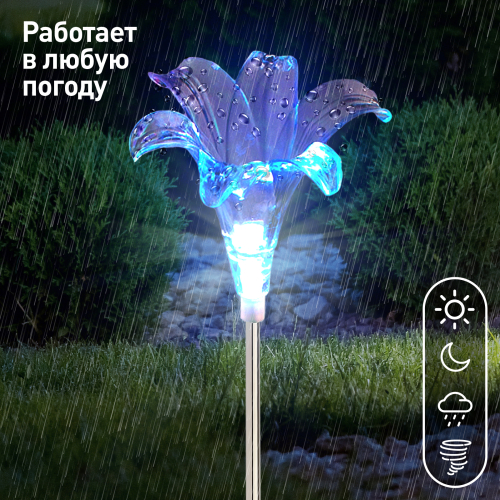 Садовый светильник ЭРА ERASF22-19 (арт. Б0053379) отличает элегантный дизайн в виде прозрачной лилии с разноцветным RGB-светом. Высота уличного светильника - 75 см. Диаметр цветка - 10 см. Солнечная батарея, закреплённая на стойке светильника, накапливает энергию для 8 часов свечения в тёмное время суток. Уличный садовый светильник может применяться в любую погоду, так как отлично защищён от влаги и пыли - IP44. Светодиодная лилия - идеальное дополнение палисадника, клумбы. Яркий разноцветный RGB-светильник уличный в виде цветка хорошо смотрится у фасада дома, у садового пруда, у забора. Особого эффекта можно достичь, купив несколько штук и разместив такие садовые светильники в составе группы.