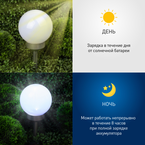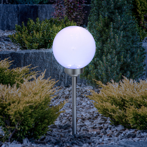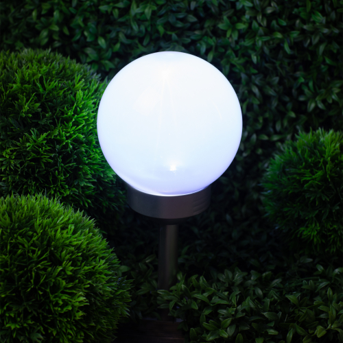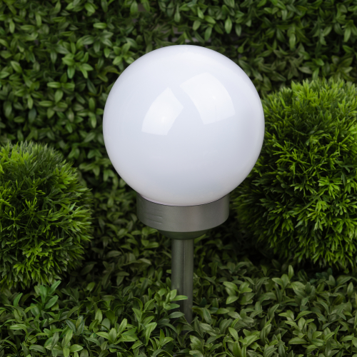 Классическая модель садового светильника в виде сферы. Мягкое свечение холодного белого света послужит прекрасным украшением при оформлении садовых дорожек и клумб.