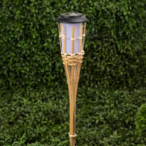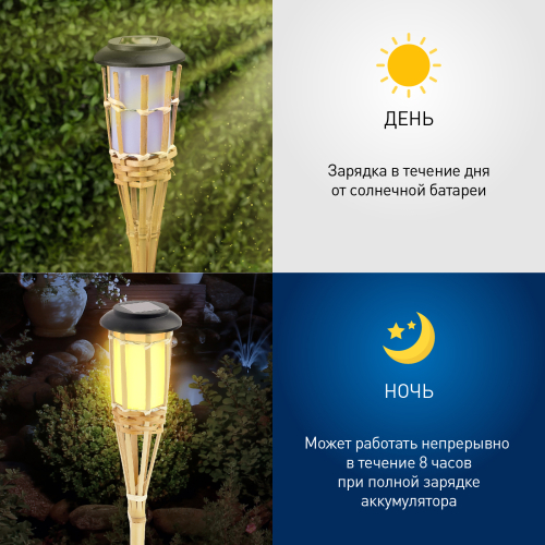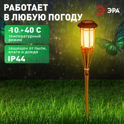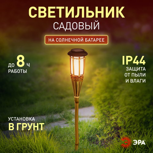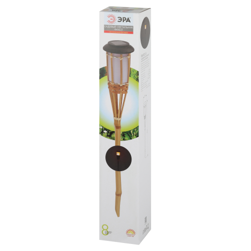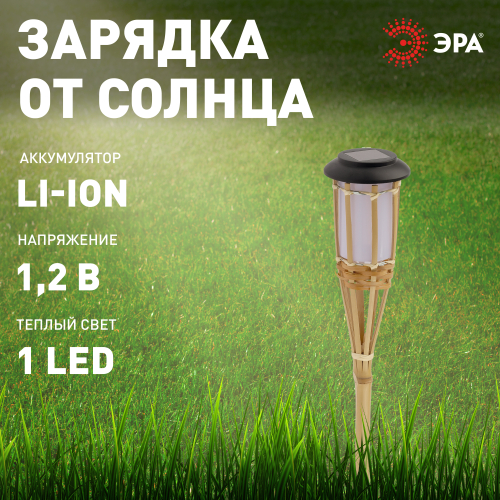 ЭРА ERASF22-24 (арт. Б0053382) - садовый светильник в виде факела на высокой бамбуковой ножке. Высота светильника - 90 см, диаметр плафона - 12 см. Всепогодный светильник садовый не боится осадков, ветра и прямых солнечных лучей. Изготовлен из высокопрочных материалов. Солнечная батарея, расположенная в верхней части светильника, накапливает световую энергию в течение дня. Вечером бамбуковый LED-факел автоматически включается и светит уютным тёплым светом. Уличный светильник ЭРА "Факел" устанавливается в грунт. Светит от полной дневной подзарядки до 8 часов. Бамбуковый дизайн органично дополняет атмосферу загородного отдыха.