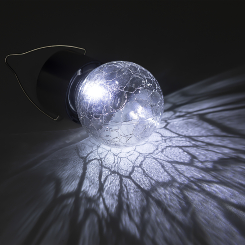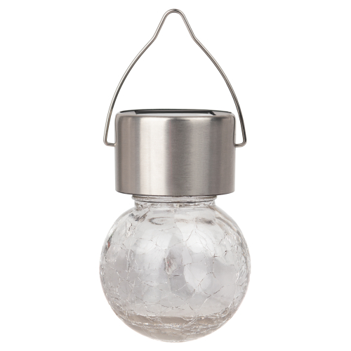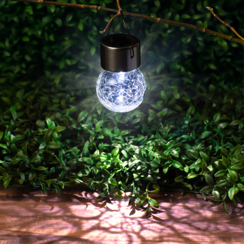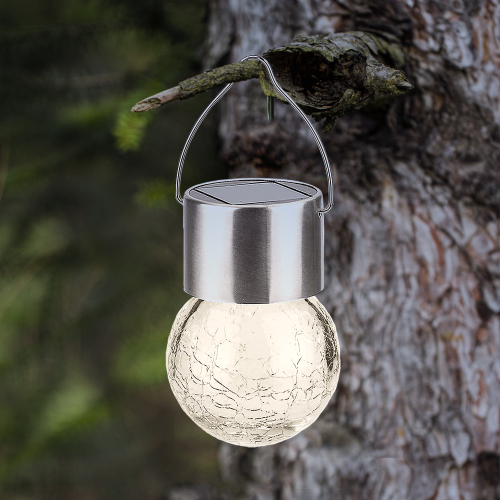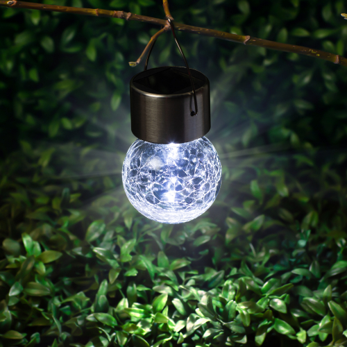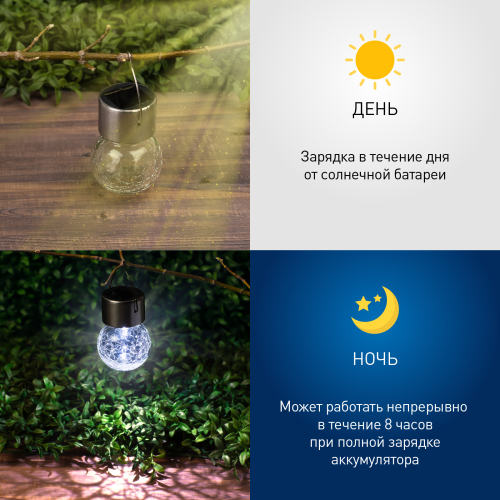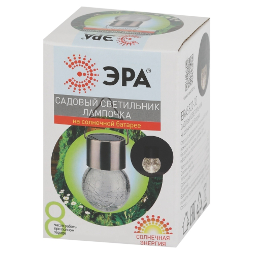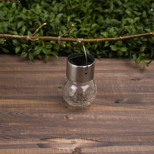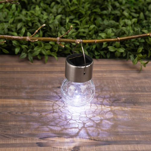 Подвесной светильник-ламочка с эффектом кракле ЭРА ERASF22-32 (арт. Б0053384). Диаметр светодиодного шара - 6 см. Металлическая ручка-подвес позволяет с комфортом применять данный уличный светильник. В дневное время садовый светильник подзаряжается естественным способом с помощью встроенной солнечной батареи, вечером автоматически включается, создаёт яркую дополнительную подсветку и красивый световой узор. Подвесная садовая LED-лампочка работает в любую погоду. Высокая защита от влаги и пыли - IP54. За счёт использования солнечной энергии для питания светильник ЭРА "Лампочка" можно размещать в любом уголке сада, перемещать с места на место.