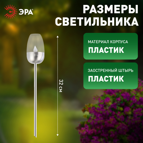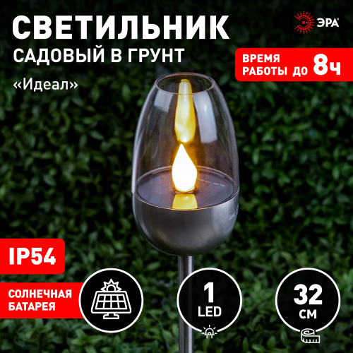 Фигурка садовая декоративная ЭРА ERASF22-37 "Идеал" станет элегантным украшением вашего загородного дома! Этот уличный светодиодный светильник легко втыкается в землю - его можно разместить в саду, украсить им пруд, альпийскую горку, подсветить тропинку или периметр участка. Садовый фонарь высотой 32 см выполнен из металла серебристого цвета и прозрачного пластика. Беспроводной светильник работает на солнечной батарее, этот тип получения энергии является самым экологичным, энергоемким, а также бесшумным. Питание происходит во включенном режиме в солнечную погоду, фигурка автоматически включается с наступлением ночи и работает до 8 часов. Имитация горения свечи и мягкий свет сделают ваш вечер теплым и изысканным!
