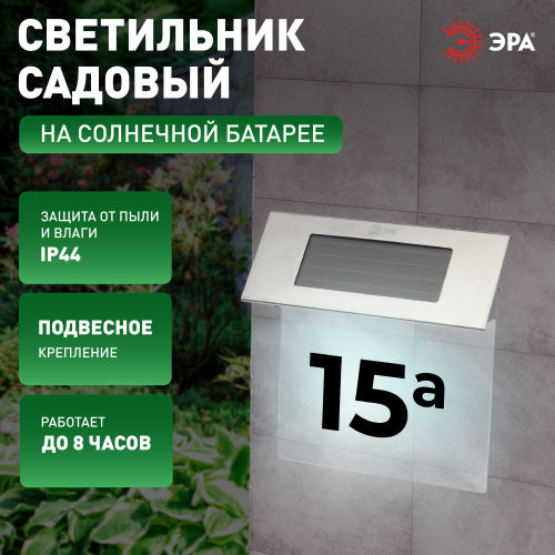 Благодаря подсвечиваемой номерной табличке с удобными креплениями на фасад здания, ваш участок приобретёт завершённый гостеприимный вид. В ассортименте ЭРА несколько указателей номера дома с подсветкой на солнечной батарее: ERAFS048-09 (арт. Б0044249), ERASF22-40 (арт. Б0053390). Светодиодный номер дома станет идеальным решением для определения вашего строения в ночное время. Светящийся номерной знак на дом защищен от воздействия осадков - IP44. Светодиодные номерные таблички от ЭРА не требуют вывода провода и подключения к электросети, поэтому монтируются быстро и в любом удобном месте на фасаде дома. В светлое время суток подзаряжаются, а с наступлением сумерек автоматически включаются, ярко подсвечивая номер вашего дома или дачи современными светодиодами. Стоит также отметить, что цифры и буквы к таким фасадным светильникам торговой марки ЭРА поставляются в комплекте. Вы получаете готовое решение, которое будет ещё до порога дома характеризовать вашу семью как гостеприимную и ценящуюю комфорт. Светильники и гирлянды ЭРА на солнечных батареях - экологически чистый и экономичный тип освещения. Их оценят и молодые люди, стремящиеся придерживаться экотрендов, и пенсионеры, внимательно относящиеся к материальным тратам.
