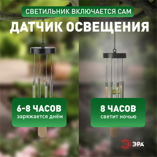 ЭРА ERASF22-46 "Солнечный ветер" (арт. Б0057664) - светящийся подвесной светильник формата ловца снов или музыки ветра. Прозрачные трубочки с пузырьками подсвечиваются разными оттенками благодаря встроенным RGB-светодиодам. Абсолютная новинка на рынке садовых светильников на солнечной батарее. Динамичное RGB-освещение в саду - стремительно набирающий популярность тренд. Подвесной садовый светильник с качающимися на ветру RGB-трубками поможет эффектно украсить беседку, террасу, балкон. Для быстрого подвеса предусмотрен удобный крючок на цепочке. В дневное время встроенная солнечная батарея аккумулирует световую энергию. Вечером этот оригинальный декоративный светильник для сада начинает светиться а режиме мультиколор.