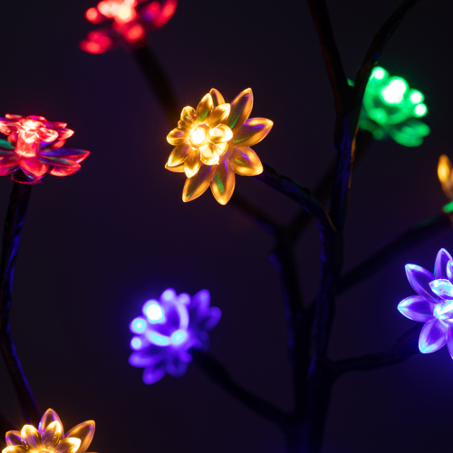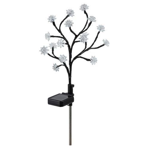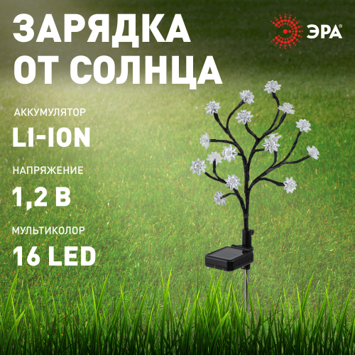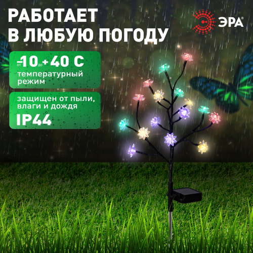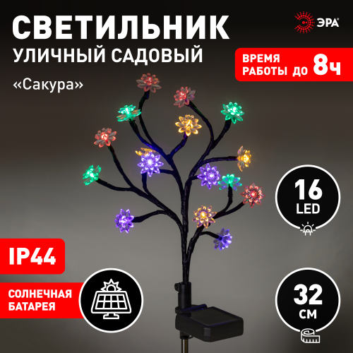 Светильник уличный ЭРА ERASF22-60 "Сакура" (арт. Б0057655) на солнечной батарее - светящееся дерево высотой 32 см для оформления сада и любой загородной территории. На каждой ветке - цветок со светодиодом. Разноцветное мягкое свечение создают 16 качественных современных LED-диодов. Такой декоративный светильник уличный продлит радостное весеннее настроение на весь сезон. Солнечная батарея встроена в стойку светильника. В течение всего светового дня компактная и мощная солнечная панель накапливает энергию. С наступлением вечера светодиодное дерево включится самостоятельно и проработает 8 часов до следующей подзарядки.