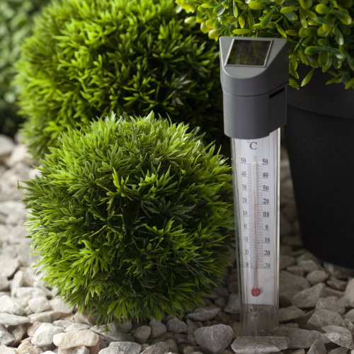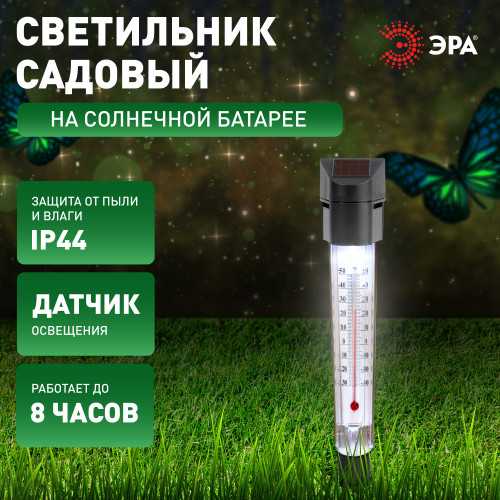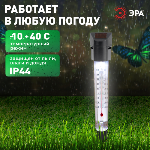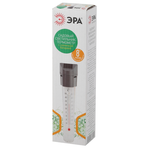 Уличный светильник градусник ERATR024-02 станет практичным дополнением на Вашем загородном участке или дома. Садовый термометр замеряет температуру воздуха. Можно устанавливать на газоне, в цветочный горшок. Устройство из пластика высотой 33 см с легко втыкается в землю с помощью заостренной ножки в комплекте. Садовый светильник работает на солнечной батарее. Данный вид получения энергии является максимально экологичным, энергоемким, а также бесшумным. Питание происходит во включенном режиме, в дневное время. В темное время суток загорается встроенная в корпус лампочка. Высокая степень защиты от пыли и влаги позволяет оставлять светильник на улице даже во время дождя. Декоративный садово-парковый светильник от бренда ЭРА компактный вариант для замера температуры воздуха на Вашем участке.
