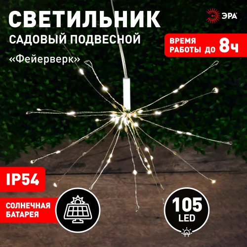 Беспроводной подвесной светильник ERAUF024-02 "Фейерверк" говорит сам за себя! Он сделает яркий акцент на садовом освещении Вашего участка. Небольшие внешние размеры позволят Вам расположить светильник на карнизе, украсить деревья, придомовую территорию и фасад. Конструкция из пластика легко подвешивается с помощью специального крепления. Садово-парковый светильник функционирует на солнечной батарее. Такой способ получения энергии является наиболее экологичным, энергоемким, а также бесшумным. Питание происходит во включенном режиме, в дневное время. С наступлением темного времени суток крохотные LED диоды, разбросанные по проволочкам, загораются желтым светом. Территория вокруг светильника сразу приобретает праздничный характер. Необычный хаотичный дизайн конструкции напоминает салют. Солнечная батарея рассчитана на 8 часов непрерывной работы. Высокая степень защиты от пыли и влаги позволяет оставлять светильник в саду во время дождя. Обращаем Ваше внимание, что перед использованием фигурки её необходимо включить и зарядить. Светильник заряжается в течение всего светового дня. Подвесной садовый светильник фейерверк от компании ЭРА нестандартное решение для украшения дачи.
