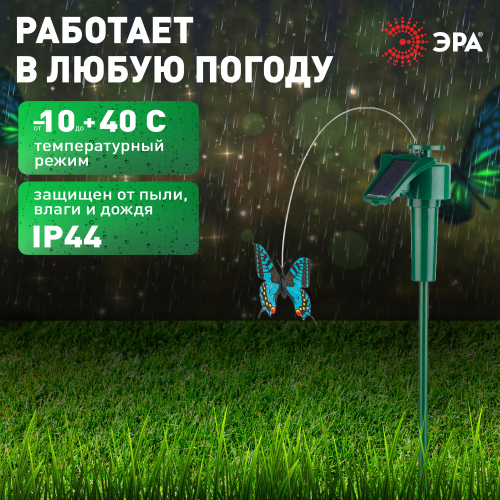 Садово-парковая декоративная композиция SL-PL42-BTF "Порхающая бабочка" станет необычным украшением Вашей дачной территории. Уличная декоративная фигурка подойдет для размещения в клумбе, кустарниках или при входе в террасу. Модель имеет высоту в 42 см и без труда вставляется в землю. Функционирует на солнечной батарее. Такой способ получения энергии является самым экологичным, энергоемким, а также бесшумным. Питание происходит во включенном режиме, днем. Светящийся элемент отсутствует, так как главная особенность декора - это цветная бабочка на тонкой проволоке, эффектно "летающая" вокруг основания. Высокий уровень пыле и влагозащиты позволяет оставлять композицию на улице даже во время дождя. Обращаем Ваше внимание, что перед использованием фигурки её необходимо включить и зарядить. Заряжается в течение всего светового дня. Садовая фигура "Порхающая бабочка" на солнечной батарее от бренда ЭРА – чудесный вариант для преображения Вашего участка.