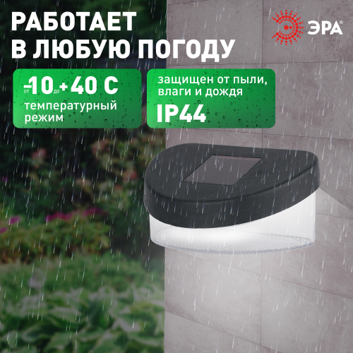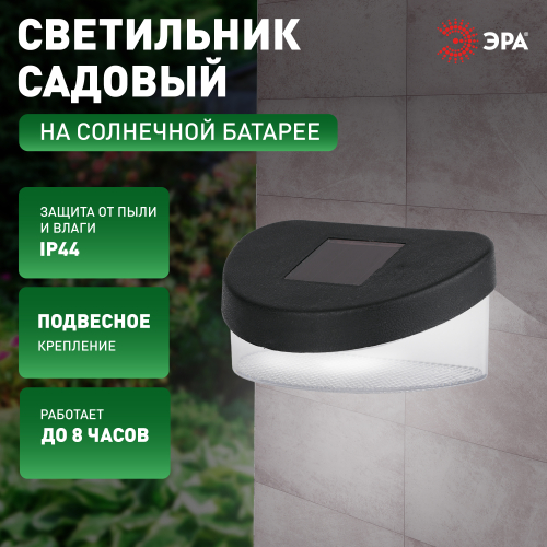 Уличный фасадный светильник выполнен из пластика, высота составляет 13 см. Устройство работает от солнечной батареи. Такой способ получения энергии является максимально экологичным, энергоемким, а также бесшумным. Питание происходит во включенном режиме, в дневное время. Подсветка реагирует на недостаток света сама и загорается с наступлением темноты. 2 LED диода светят ярким белым светом. Благодаря прозрачному корпусу свет будет рассеиваться на длинное расстояние, что позволит осветить придомовую территорию. Подсветка может длиться непрерывно в течение 8 часов. Высокая степень защиты от пыли и влаги позволяет оставлять садовый светильник на улице даже во время непогоды. Настенный светильник на солнечной батарее от ЭРА сделает Ваш загородный отдых намного ярче!