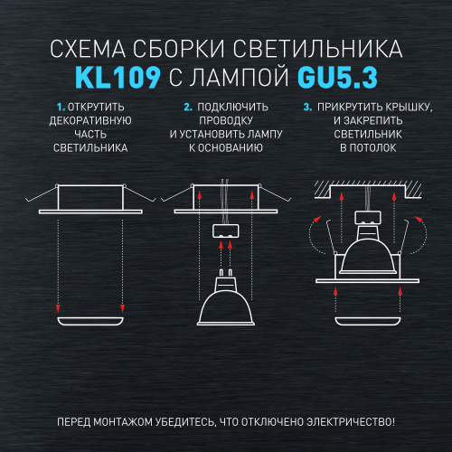 Встраиваемый потолочный светильник ЭРА KL109 WH/BK - это стильный и функциональный источник света, предназначенный для использования с лампами типа GU5.3 с максимальной мощностью до 12 Вт. Он имеет матовый корпус в сочетании белого и черного цветов. Благодаря своей конструкции, точечный светильник может быть встроен не только в потолок, но также в стену или кухонный гарнитур, что позволяет создавать уникальные световые акценты и решать различные дизайнерские задачи. Он подходит для установки на различных видах поверхностей, таких как гипсокартон или натяжные потолки, что делает его универсальным решением для освещения любого помещения. Корпус прибора изготовлен из качественного и прочного алюминия, что гарантирует долгий срок службы и устойчивость к коррозии. Диаметр данной модели составляет 8 см, диаметр врезного отверстия - 6,5 см. ВНИМАНИЕ, лампочка в комплект не входит.