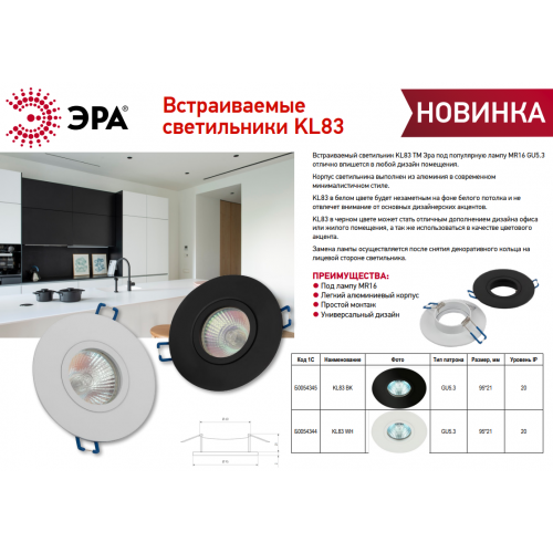 Светильник встраиваемый KL83 WH MR16/GU5.3 - замечательное решение для любой комнаты в вашем доме! Точечные светильники можно использовать как в качестве основного освещения, так и для создания акцентов в определенных зонах комнаты. Благодаря скрытой части корпуса светильники можно встраивать не только в потолок, но и в стены, создавая разный стиль помещений. Светильник ЭРА с приятным дизайном подойдет для комнат с разным интерьером: от лофта до модерна, классицизма или минимализма. При помощи точечных светильников можно освещать только те участки помещения, которыми вы пользуетесь в данный момент, не затрачивая лишнюю элеткроэнергию. Максимальная мощность лампы составляет 50 Вт. Корпус встраиваемого светильника изготовлен из алюминия, что делает его особенно удобным и надежным в использовании. Диаметр отверстия, требуемого для установки светильника составляет 60 миллиметров, а размер корпуса светильника – 95x21 миллиметров. Цоколь под лампу GU5.3 входит в комплект. Купив точечный светильник бренда ЭРА, вы останетесь довольны и сможете создать приятную атмосферу и уют в Вашем доме! Внимание: лампа не входит в комплектацию.