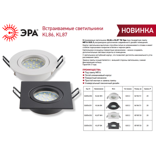 Точечные светильники KL86 WH – прекрасное решение для самых разных помещений в Вашем доме или квартире. С помощью встраиваемых светильников можно подсвечивать от рабочего места до пространства для готовки на кухне. KL86 WH выполнен из алюминия, отличающегося своими качеством и надежностью. Внешний размер светильника - 84*21 миллиметров, а монтажный - 70 миллиметров. Для данного светильника подойдет лампа MR16 с цоколем GU5.3 максимальной мощности 50 Вт. Степень защиты светильника - IP20, она дает возможность устанавливать его в разных помещениях, кроме тех, где повышена влажность. Светильник белого цвета, благодаря чему его можно размещать в самых разных по стилю интерьерах: минимализм, хай-тек, модерн, контемпорари или скандинавский. После установки Ваша комната преобразится и наполнится приятной атмосферой. Внимание! Лампа не входит в комплект.