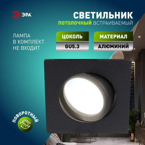 Светильник встраиваемый KL87 BK MR16/GU5.3 - отличный выбор для любого помещения в вашей квартире! Точечные светильники подходят как для основного освещения, так и для создания акцентов в определенных зонах комнаты. Благодаря скрытой части корпуса светильники можно встраивать не только в потолок, но и в стены, создавая разный стиль помещений. Светильник ЭРА с приятным дизайном подойдет для комнат с разным интерьером: от лофта до модерна, классицизма или минимализма. При помощи точечных светильников можно освещать только те участки помещения, которыми вы пользуетесь в данный момент, не затрачивая лишнюю элеткроэнергию. Максимальная мощность лампы составляет 50 Вт. Корпус встраиваемого светильника изготовлен из алюминия, что делает его особенно удобным и надежным в использовании. Диаметр отверстия, требуемого для установки светильника составляет 70 миллиметров, а размер корпуса светильника – 85x85x20 миллиметров. Цоколь под лампу GU5.3 входит в комплект. Купив точечный светильник бренда ЭРА, вы останетесь довольны и сможете создать приятную атмосферу и уют в Вашем доме! Внимание: лампа не входит в комплектацию.