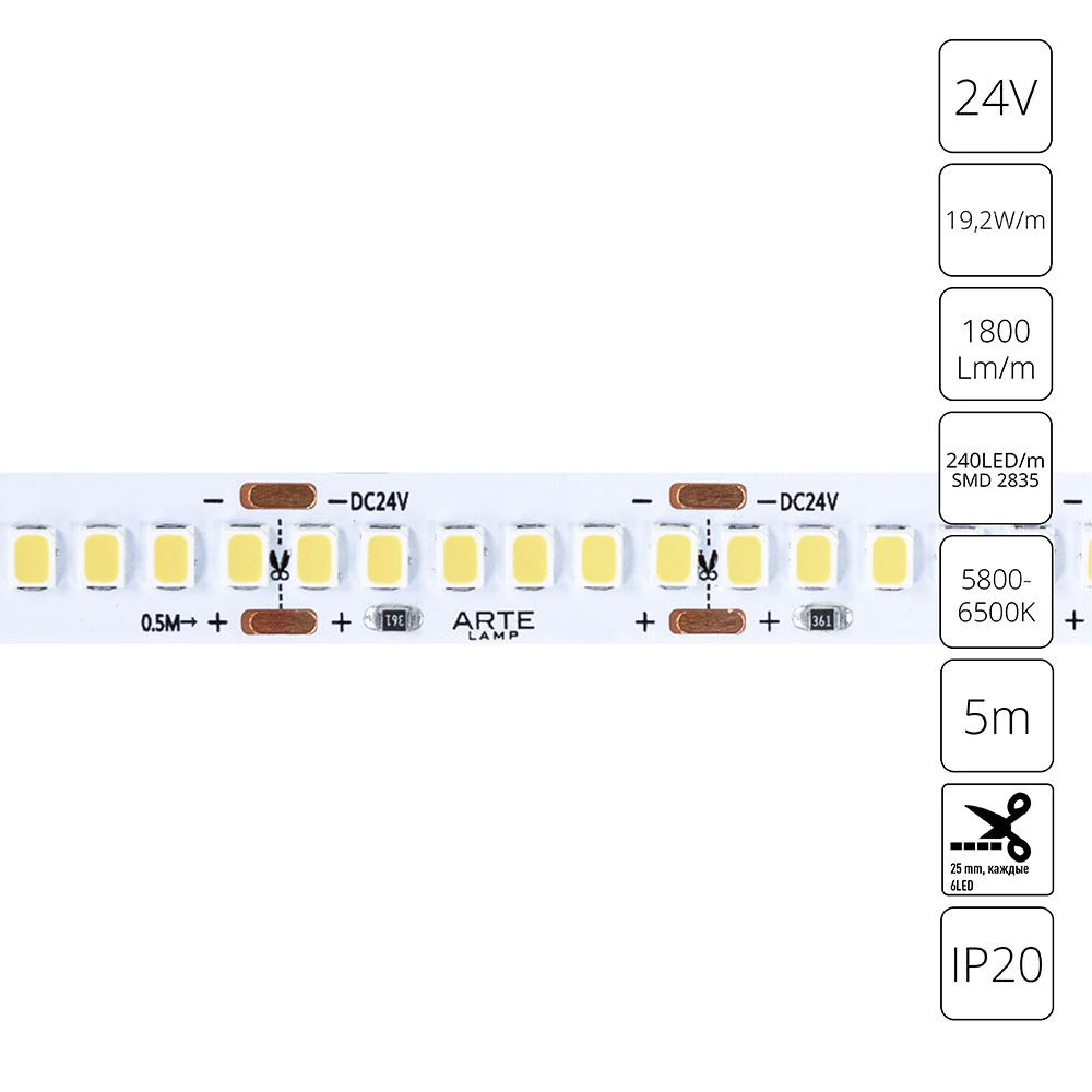 Светодиодная лента A2424010-03-6K серии TAPE. Длина 5 m. Светодиодная лента состоит из гибкой медной печатной платы со светодиодами и клейкого слоя 3М, который обеспечивает удобство монтажа. Лента предназначена для декоративной подсветки и основного освещения внутри помещений, рассчитана для работы с источником постоянного напряжения 24В. Параметры пылевлагозащиты IP20. Страна происхождения бренда — ИТАЛИЯ.