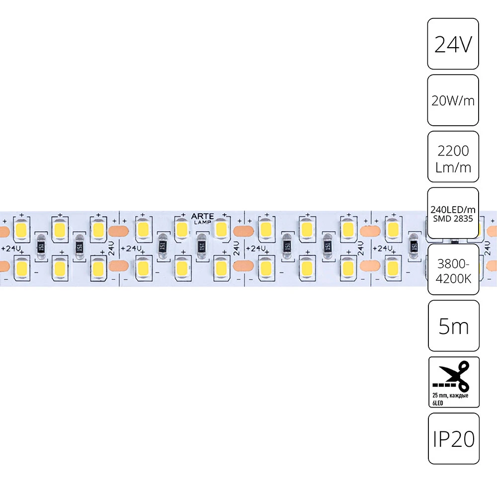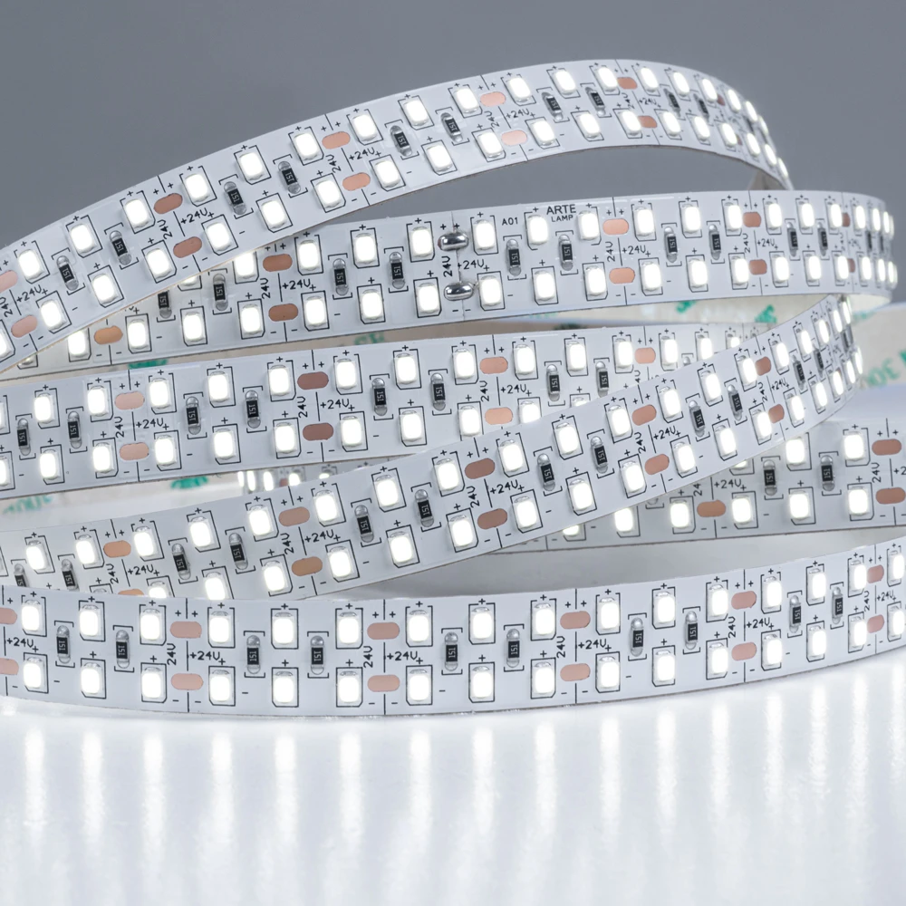 Светодиодная лента A2424015-02-4K серии TAPE. Длина 5 m. Светодиодная лента состоит из гибкой медной печатной платы со светодиодами и клейкого слоя 3М, который обеспечивает удобство монтажа. Лента предназначена для декоративной подсветки и основного освещения внутри помещений, рассчитана для работы с источником постоянного напряжения 24В. Параметры пылевлагозащиты IP20. Страна происхождения бренда — ИТАЛИЯ.