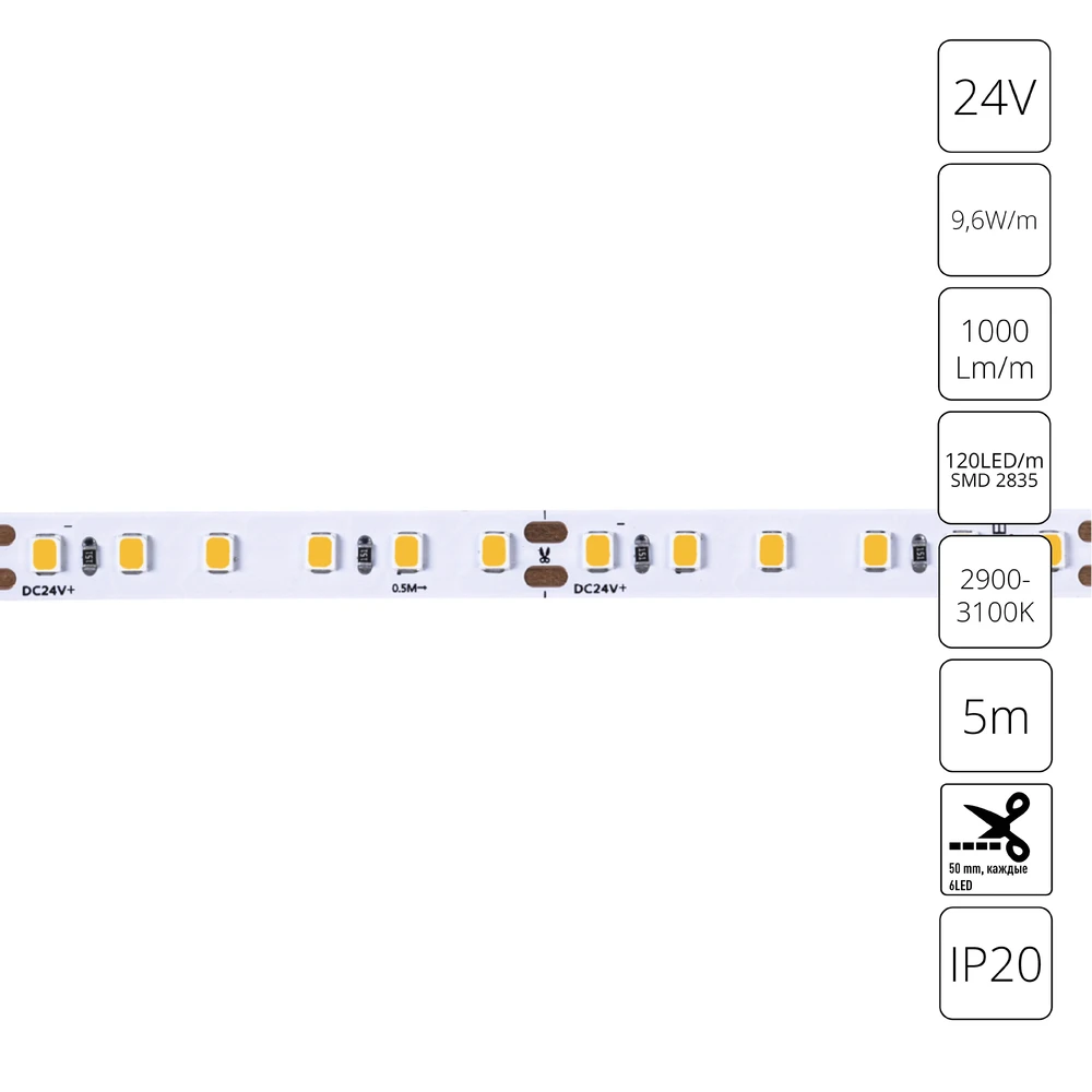 Светодиодная лента A2412008-01-3K серии TAPE. Длина 5 m. Светодиодная лента состоит из гибкой медной печатной платы со светодиодами и клейкого слоя 3М, который обеспечивает удобство монтажа. Лента предназначена для декоративной подсветки и основного освещения внутри помещений, рассчитана для работы с источником постоянного напряжения 24В. Параметры пылевлагозащиты IP20. Страна происхождения бренда — ИТАЛИЯ.