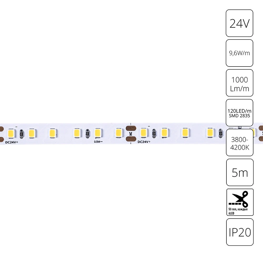 Светодиодная лента A2412008-02-4K серии TAPE. Длина 5 m. Светодиодная лента состоит из гибкой медной печатной платы со светодиодами и клейкого слоя 3М, который обеспечивает удобство монтажа. Лента предназначена для декоративной подсветки и основного освещения внутри помещений, рассчитана для работы с источником постоянного напряжения 24В. Параметры пылевлагозащиты IP20. Страна происхождения бренда — ИТАЛИЯ.