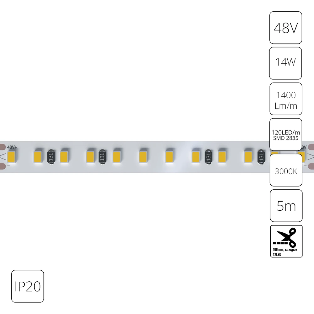 Светодиодная лента A4812010-05-3K серии TAPE. Длина 5 m. Светодиодная лента состоит из гибкой медной печатной платы со светодиодами и клейкого слоя 3М, который обеспечивает удобство монтажа. Лента предназначена для декоративной подсветки и основного освещения внутри помещений, рассчитана для работы с источником постоянного напряжения 48В. Параметры пылевлагозащиты IP20. Страна происхождения бренда — ИТАЛИЯ.