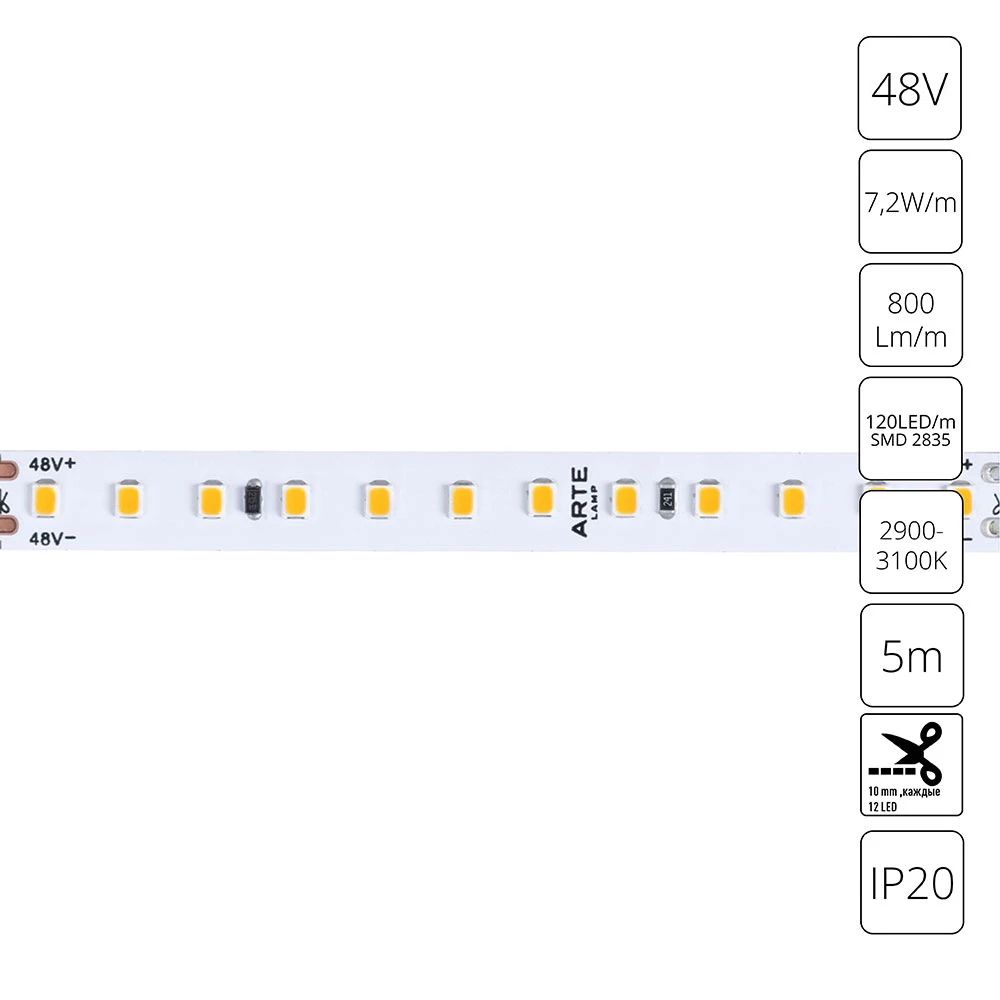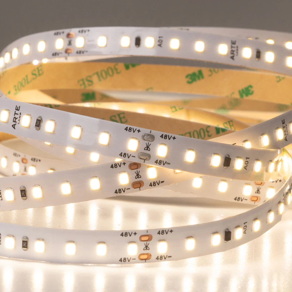 Светодиодная лента A4812010-01-3K серии TAPE. Длина 5 m. Светодиодная лента состоит из гибкой медной печатной платы со светодиодами и клейкого слоя 3М, который обеспечивает удобство монтажа. Лента предназначена для декоративной подсветки и основного освещения внутри помещений, рассчитана для работы с источником постоянного напряжения 48В. Параметры пылевлагозащиты IP20. Страна происхождения бренда — ИТАЛИЯ.