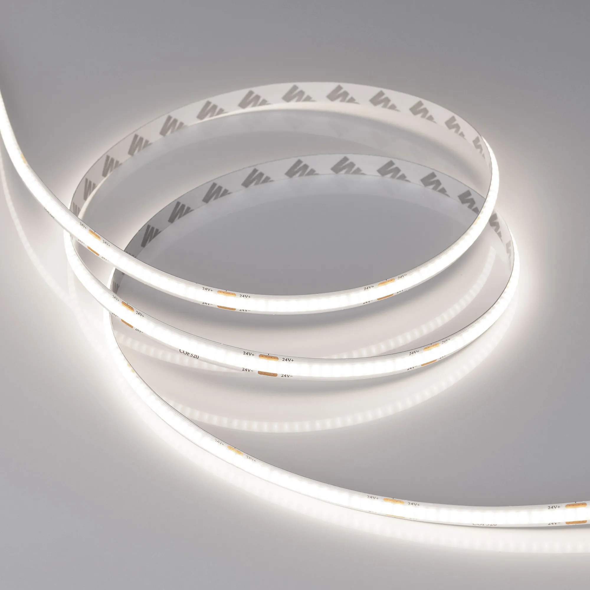 Светодиодная лента сплошного свечения COB серии X320 шириной 8 мм, мощностью 8 Вт/м. Напряжение питания 24 В. Светодиоды CSP, 320 шт/м, белого цвета свечения (6000K). Высокий индекс цветопередачи CRI>90 обеспечивает точное восприятие цветовых оттенков при освещении любых жилых, офисных или производственных помещений. Минимальный отрезок 50 мм. В ленте используется технология ReelToReel, данная технология обеспечивает производство ленты без пайки и повышает ее механическую прочность. Эффект сплошной линии света создается без применения рассеивающих экранов. Используется для декоративной подсветки рекламных конструкций и витрин.