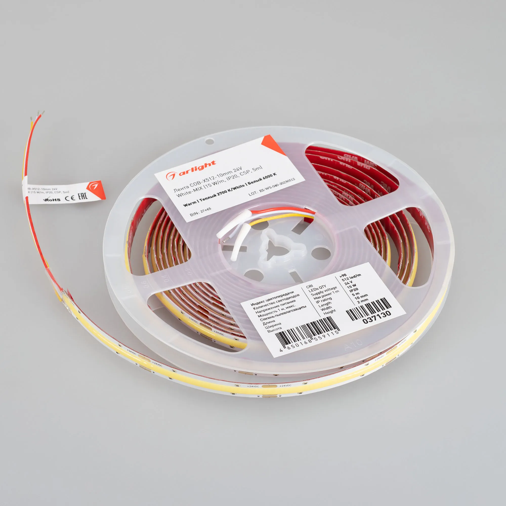 Светодиодная лента сплошного свечения COB серии X512, шириной 10 мм, мощностью 15 Вт/м, с изменяемым цветом белого свечения в широком диапазоне (MIX) от теплого (2700K) до белого (6000K). Напряжение питания 24 В. Светодиоды CSP, (512 шт/м). Высокий индекс цветопередачи CRI>90. Минимальный отрезок 62.5 мм (32 светодиода). Двухканальная лента COB с тремя проводами для подключения, управляется любым MIX-контроллером. Применяется для создания биодинамического освещения, декоративной подсветки интерьера, ниш, рекламных конструкций, витрин, рабочих зон, зон отдыха, мебели. Обязательна установка на профиль.