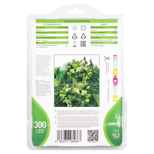 Светодиодная лента для растений GREEN LINE ЭРА FITO-Strip Light-Ra90-300LED-5m-12V-IP65 — это современное и эффективное решение для фитоосвещения дома и в теплицах. Полный спектр света способствует здоровому росту растений, обеспечивая оптимальные условия на всех стадиях их развития. Длина ленты 5 метров, с возможностью регулировки длины — её можно отрезать по специальным меткам (шаг реза - 5см). Двусторонний скотч (в комплекте) позволяет быстро закрепить ленту на любых гладких поверхностях. Лента поставляется с адаптером 12В, что упрощает подключение. КПД на 20–30% выше, чем у моделей с питанием от USB. Лента излучает мягкий розоватый свет, близкий к нейтральному белому, который безопасен для глаз. Для достижения наилучших результатов рекомендуется использовать её вместе с дневным или нейтральным белым светом (4000 К). Оптимальное расстояние до растений составляет 5–20 см. Надёжность и универсальность: Класс защиты IP65 обеспечивает устойчивость к влаге и пыли. Лента имеет эпоксидное покрытие и угол рассеивания света 120°, что позволяет равномерно освещать растения. Устройство безопасно в условиях повышенной влажности, например, при поливе или опрыскивании. ЭРА FITO-Strip Light — это идеальное решение для осенне-зимней подсветки растений и подготовки к новому сезону выращивания рассады. Простота установки, универсальность и высокая производительность делают её обязательным выбором для садоводов любого уровня.