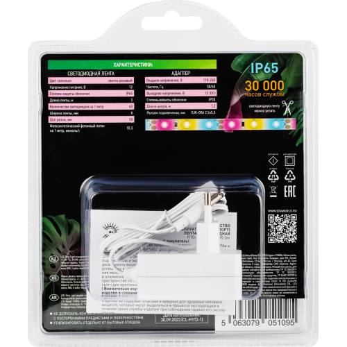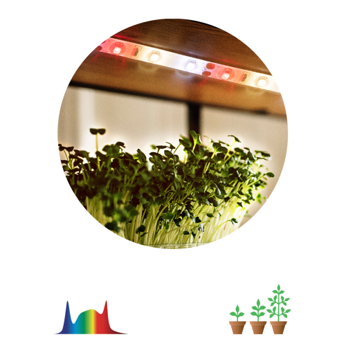 Лента надёжно защищена от влаги и пыли (IP65), имеет защитную эпоксидную линзу с отличной КСС — 120 градусов. Растения можно поливать и опрыскивать, без страха повредить фитоленту.
